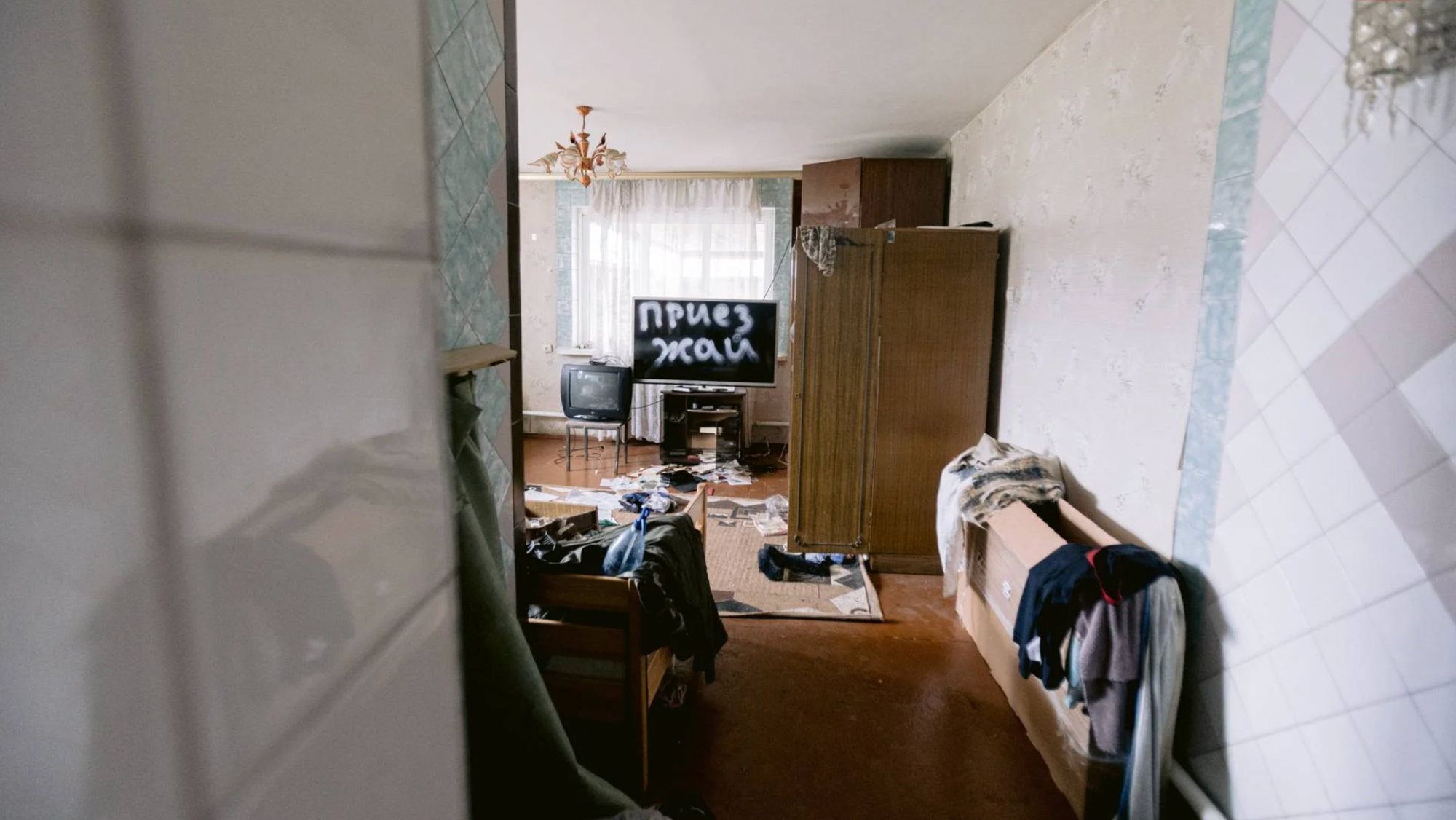 An inscription by Russian soldiers reads “Come home” on the TV screen of a private apartment in the Velyka Dymerka, Kyiv region (photo courtesy Proslav.info)