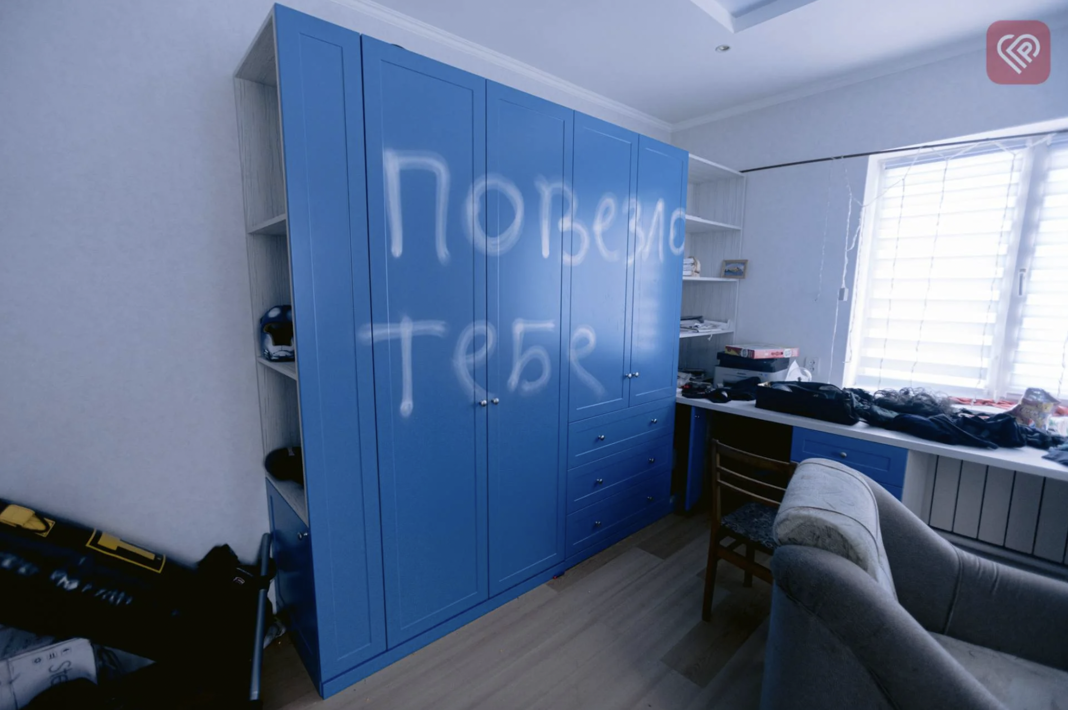 A graffiti reads “Lucky you are” on the dresser in a private apartment, Velyka Dymerka, Kyiv region (image courtesy Proslav.info)