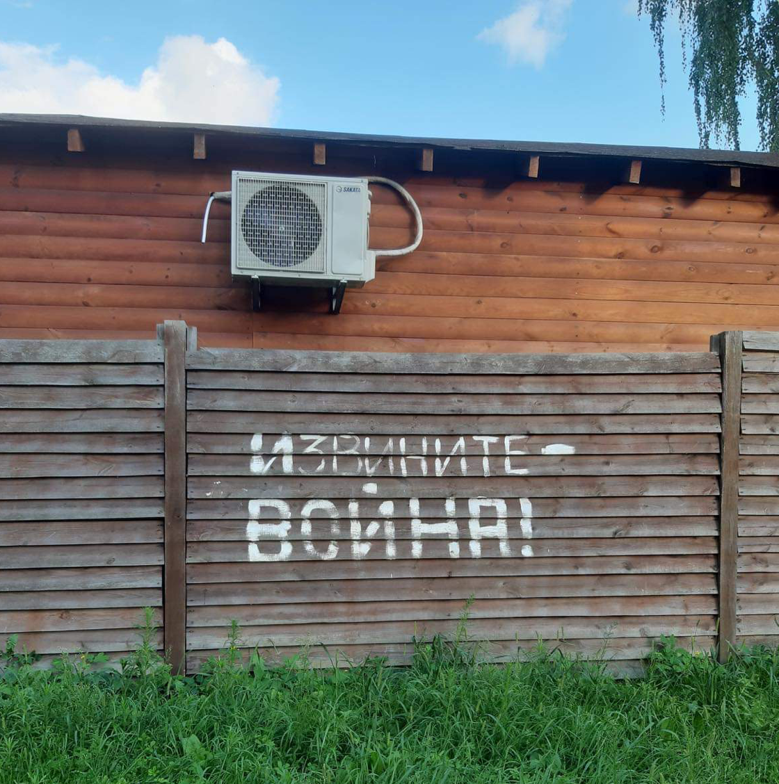 An inscription by the Russian military reads "Sorry — it's war!" on the fence of a private house, Zdvyzhivka, Kyiv region, August 2022 (photo by Oksana Semenik, courtesy Mizhvukhamy)