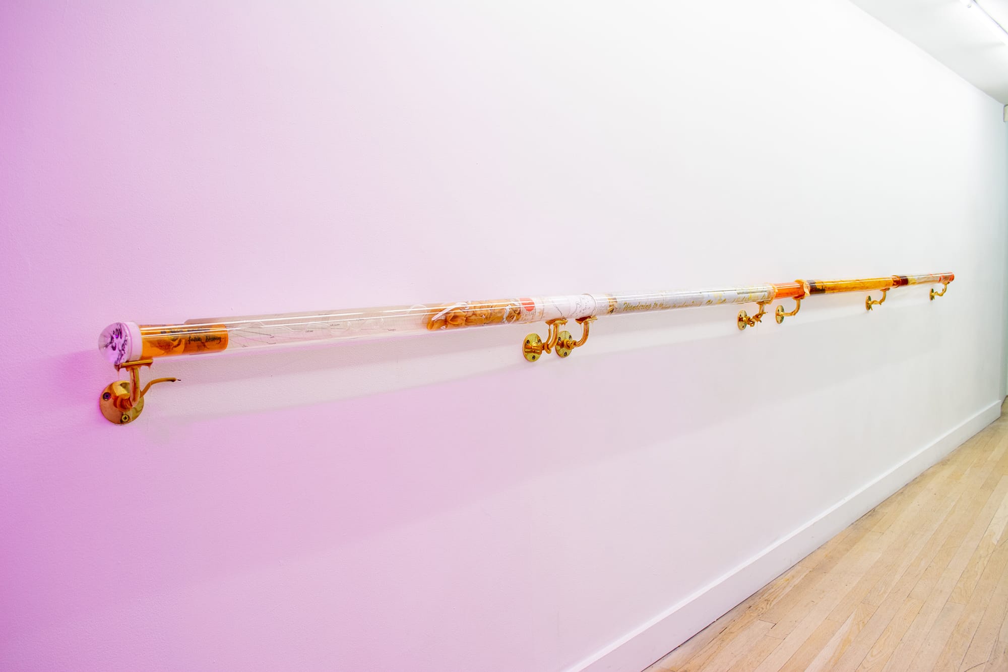 An almost 14-foot-long handrail, “‘Dream’ Guid” (2018), is a fitting design element to usher visitors into Mo Kong’s Making A Stationary Rain On The North Pacific Ocean, curated by artist Steffani Jemison at CUE Art Foundation. Located in the hallway connecting the vestibule to the main gallery space, the handrail consists of interconnected acrylic tubes filled with a bricolage of rubber, glass, beeswax, pollen, and shredded government documents. Handrails provide physical support for humans as they navigate built space, but Kong’s artistic handrail, a notional “guid[e],” offers visitors minimal physical or conceptual assistance. The artwork does not look sturdy enough to bear much body weight, and its mish-mash of contents and scare-quoted, misspelled title raise more questions about the exhibition than they answer.
