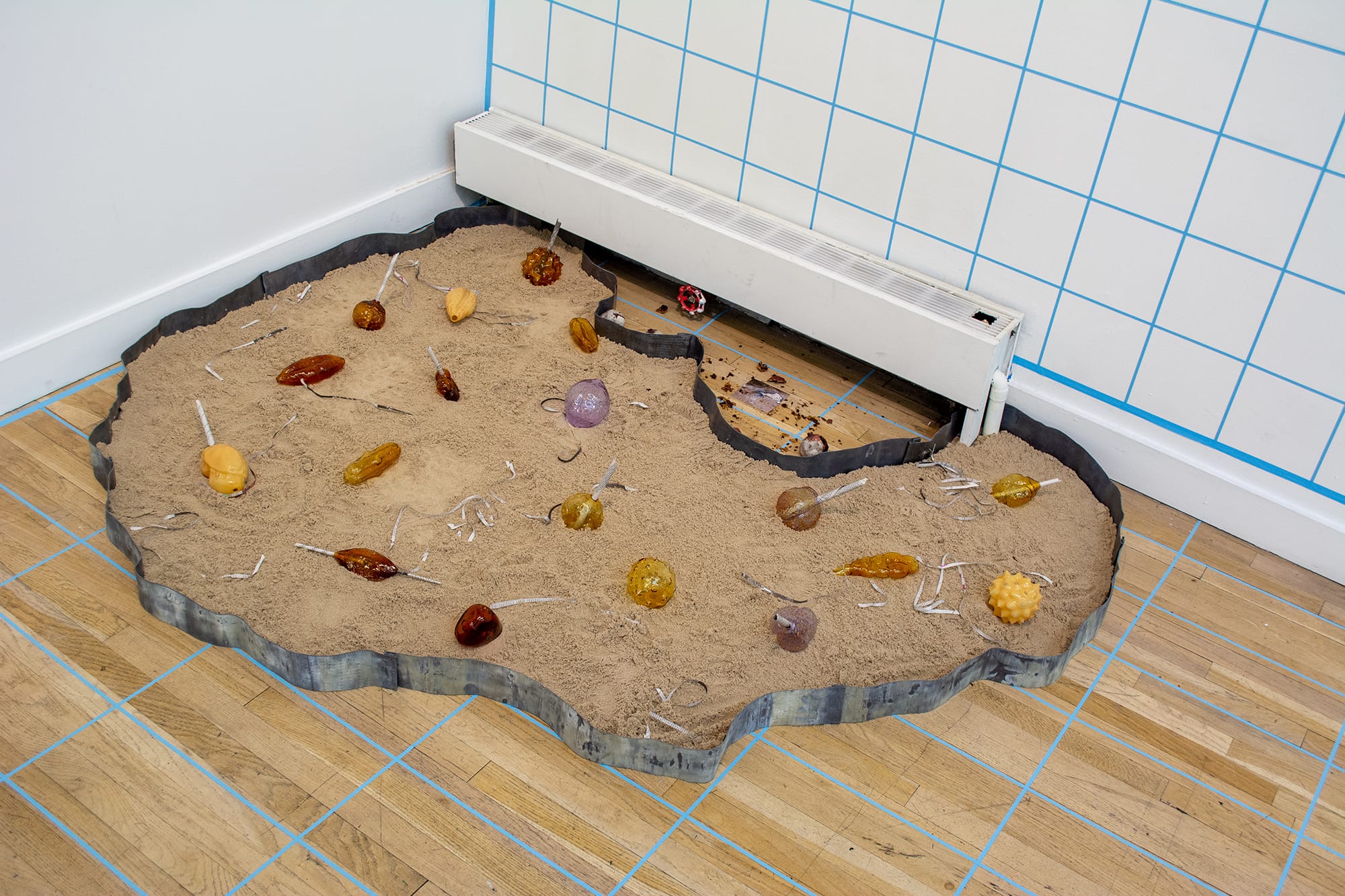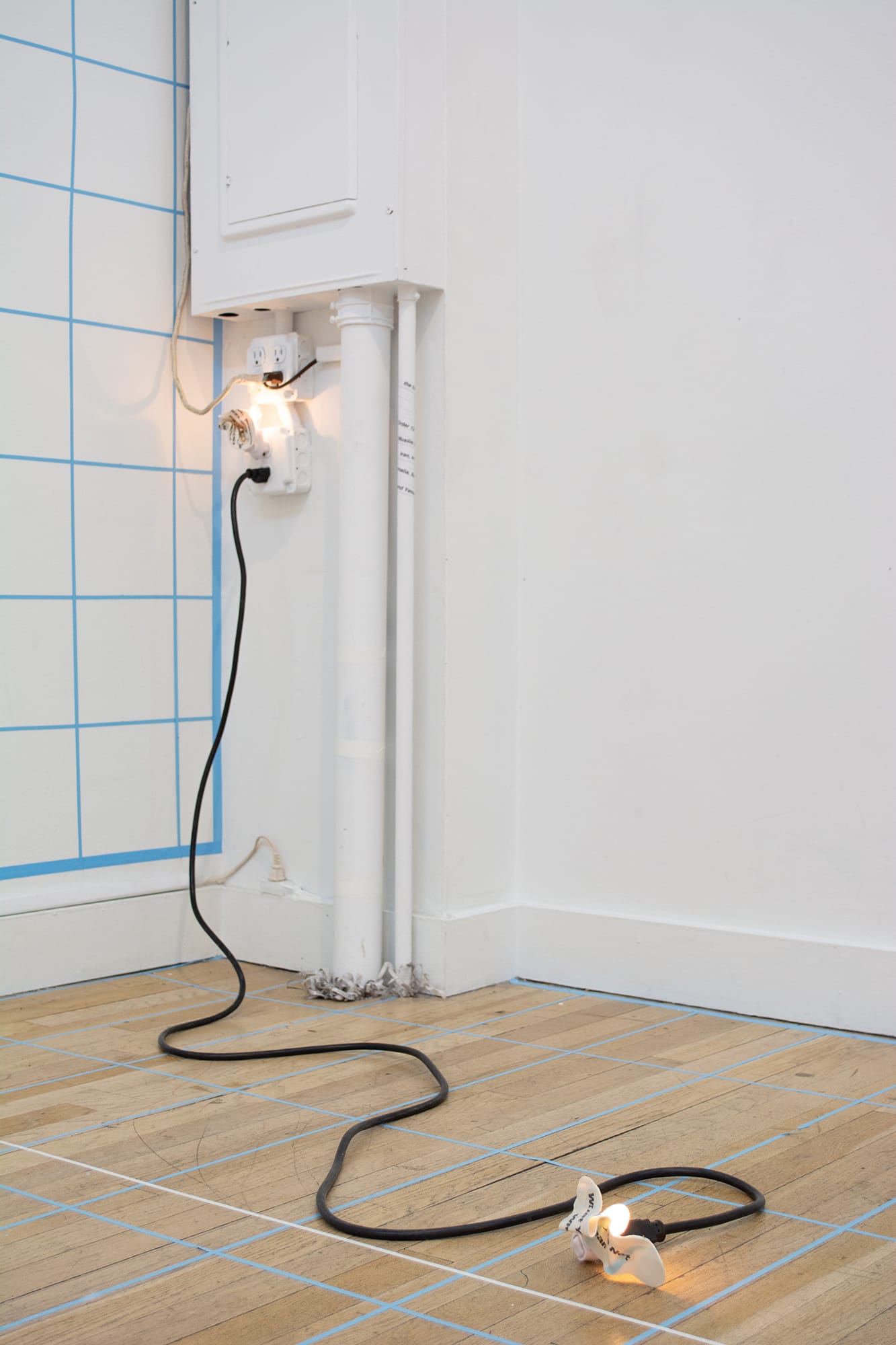 The main gallery is just as mysterious. Conceived as a geopolitical map of a near-future in which climate change migration has fomented a Cold War between China and the United States, the room’s floor and the bottom halves of its lengthwise walls are covered in thin strips of blue painter’s tape to form grids of footprint-sized rectangles. In some places, strips of white painter’s tape, with descriptive markings such as “Arctic Circle” and “0°/ Equator,” provide a semblance of geospatial orientation. Spartan sculptural works — for instance, nightlights plugged into the wall and resting on the floor (“Nightlight I” and “Nightlight II,” both 2019) or diffusers dotted with sea snails that emit handmade fragrances (“Echo: China” and “Echo: US,” both 2019) — are distributed around the room. The entire installation has a guarded and withdrawn quality, as if the grid that mapped this world was also as a dystopian surveillance mechanism.