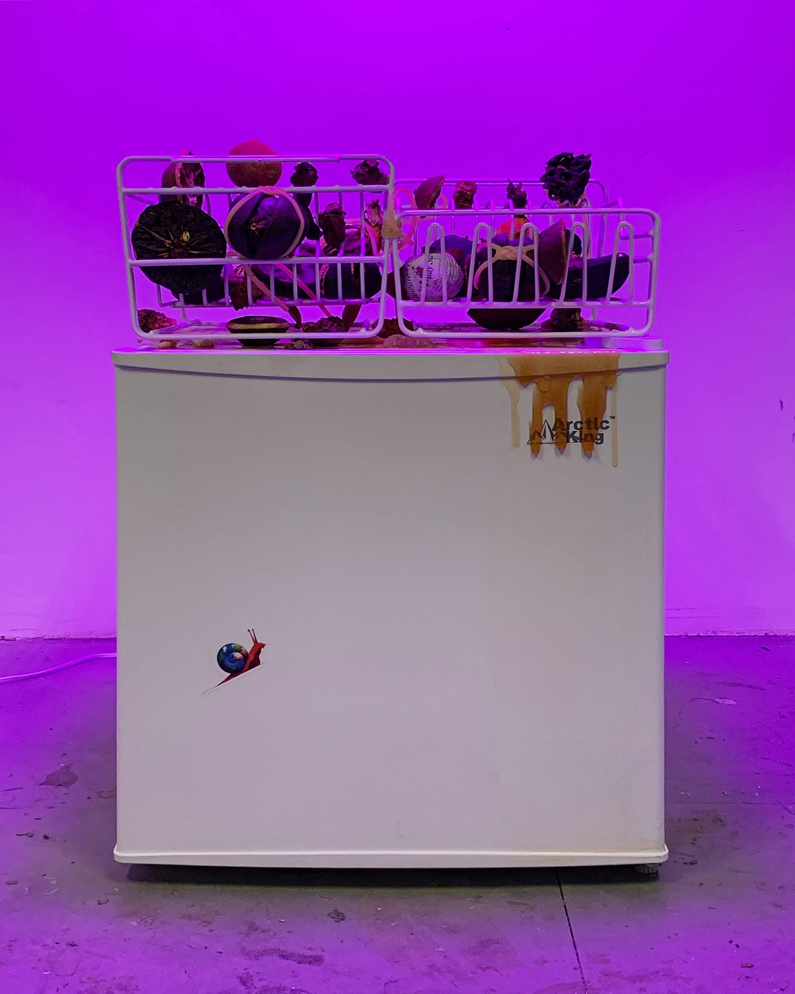These veiled clues give the exhibition the feel of an Easter egg hunt, or a connect-the-dots game in which not all the dots have been numbered. Every gallery nook and cranny harbors colorful surprises, such as the unlabelled lollipop stuck to a floor corner, or the mini freezer in “Seeking Common Ground,” whose door opens to reveal frost-covered, handmade resin popsicles. Similar to a Thomas Pynchon novel, the profusion of semi-connected signifiers tease the audience with the prospect of a conspiracy, while ultimately frustrating the desire for a transparent and cohesive larger meaning. This epistemological environment — with its interplay between disclosure and concealment, inside and outside — produces a version of the paranoia that authoritarian regimes instill in their citizenry.