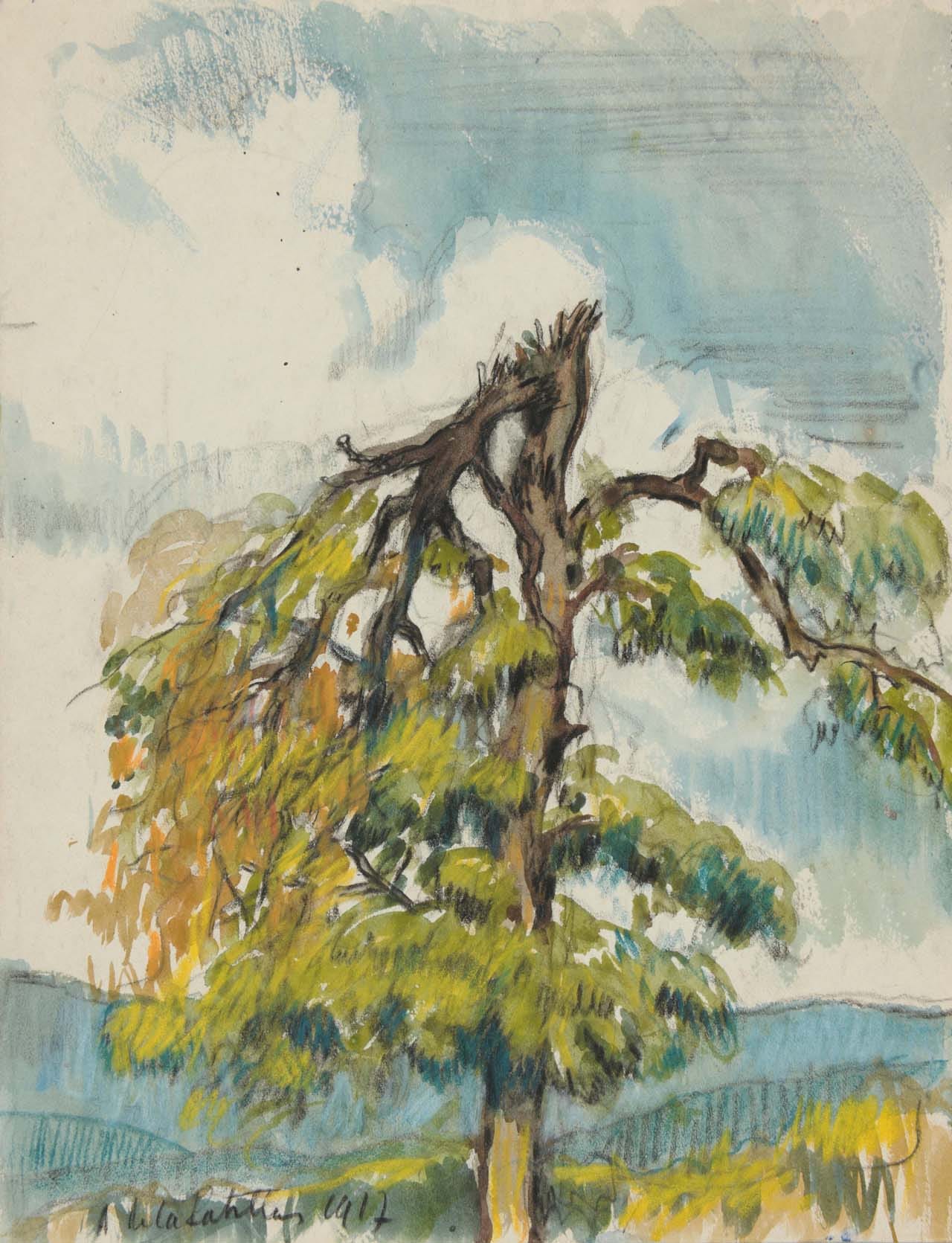 Much like Otto Dix, Fernand Léger, and George Braque, La Patellière belonged to the “lost generation,” as it was dubbed by Gertrude Stein: the generation of those who grew up in the muddy trenches of World War I. But La Patellière is unique in that he spent nearly eight years serving in the French army between 1911 and 1919, from ages 21 to 29. Wounded twice, he was commended twice for acts of bravery and received the Military Cross of honor. He saw fighting and fatality close-up and personal. But he bore witness to this catastrophic war not by depicting the fighting directly, but rather the resulting wounded foliage, for example in his more than capable watercolor “Grand arbre la tête brisée par un obus” (1917). It’s interesting that he never straightforwardly represented his battles, only their grim ruins.