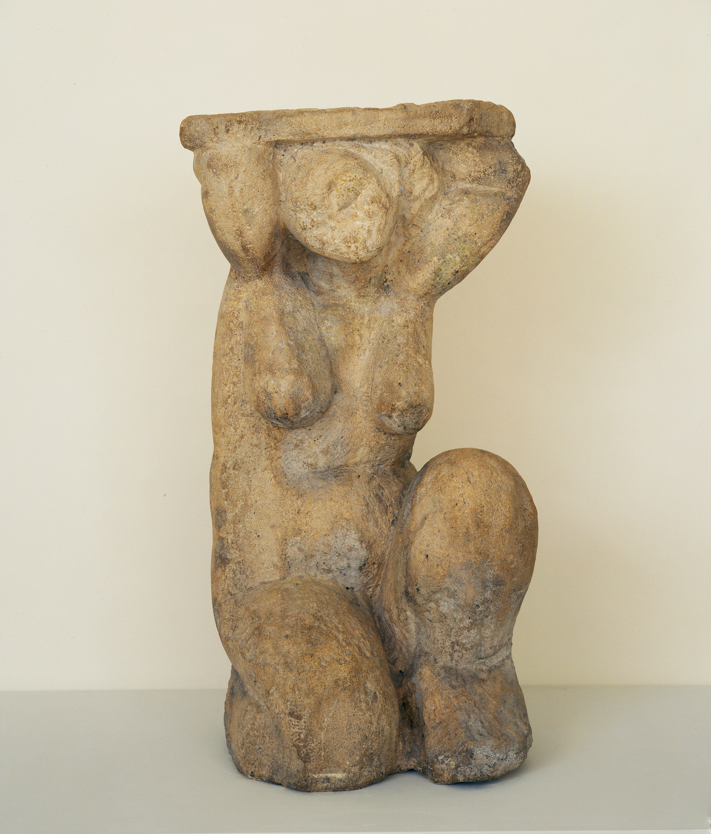 The final, and largest, room in the exhibition is devoted to the caryatid, the architectural motif depicting a crouching nude shouldering the weight of a building. This is where Modigliani is at his most carnal and hallucinatory, especially in the blue caryatid in gouache, watercolor, chalk, and graphite, dated c. 1914, borrowed from the Museum of Fine Arts in Houston, and the grand limestone sculpture of the same date, on loan from the Museum of Modern Art, New York.