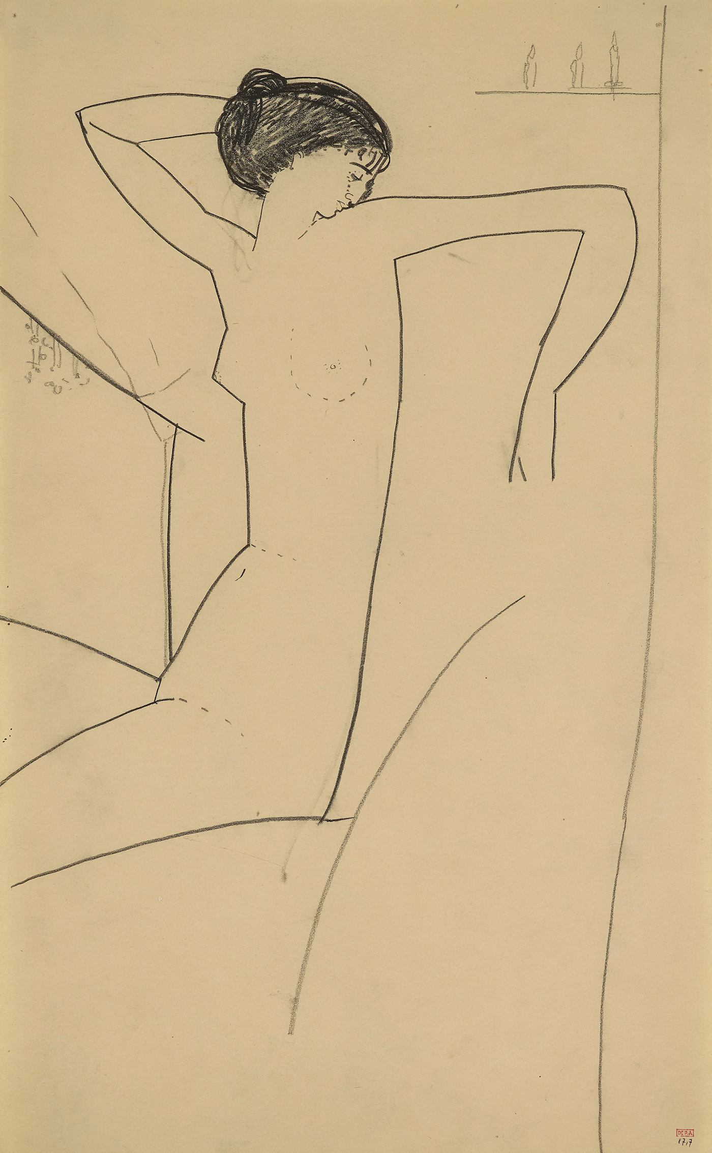 It is with these drawings, some from 1908 but the majority done around 1911, that Modigliani began to integrate the lessons of Cubism into his work, sublimating the erotic into slices of curved and straight lines, ennobling the languid poses of his models (including the nude Akhmatova, in several images) with hieroglyphic grandeur.