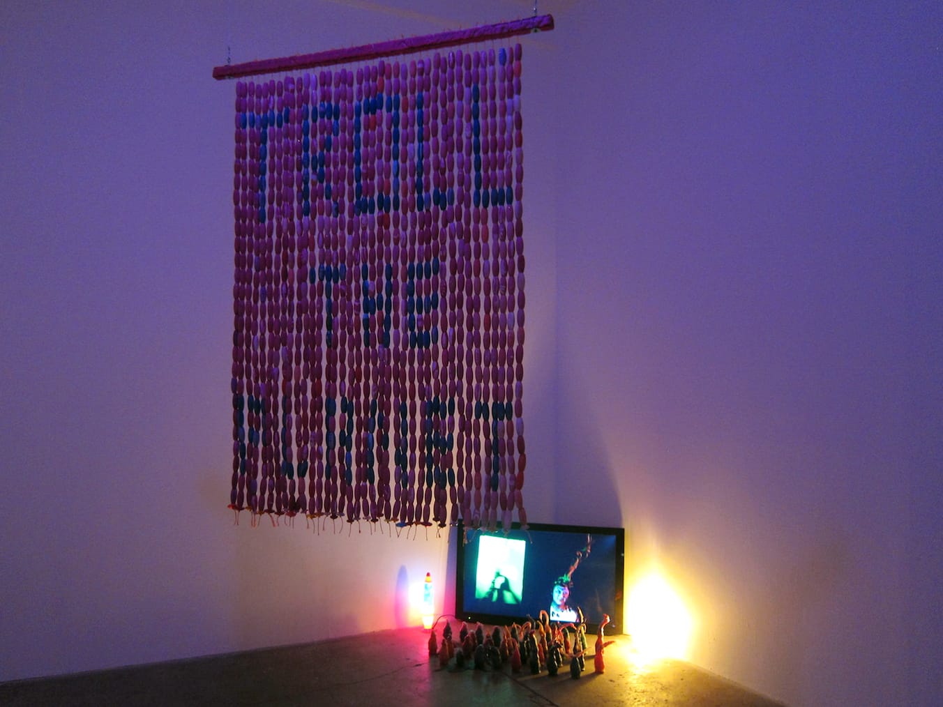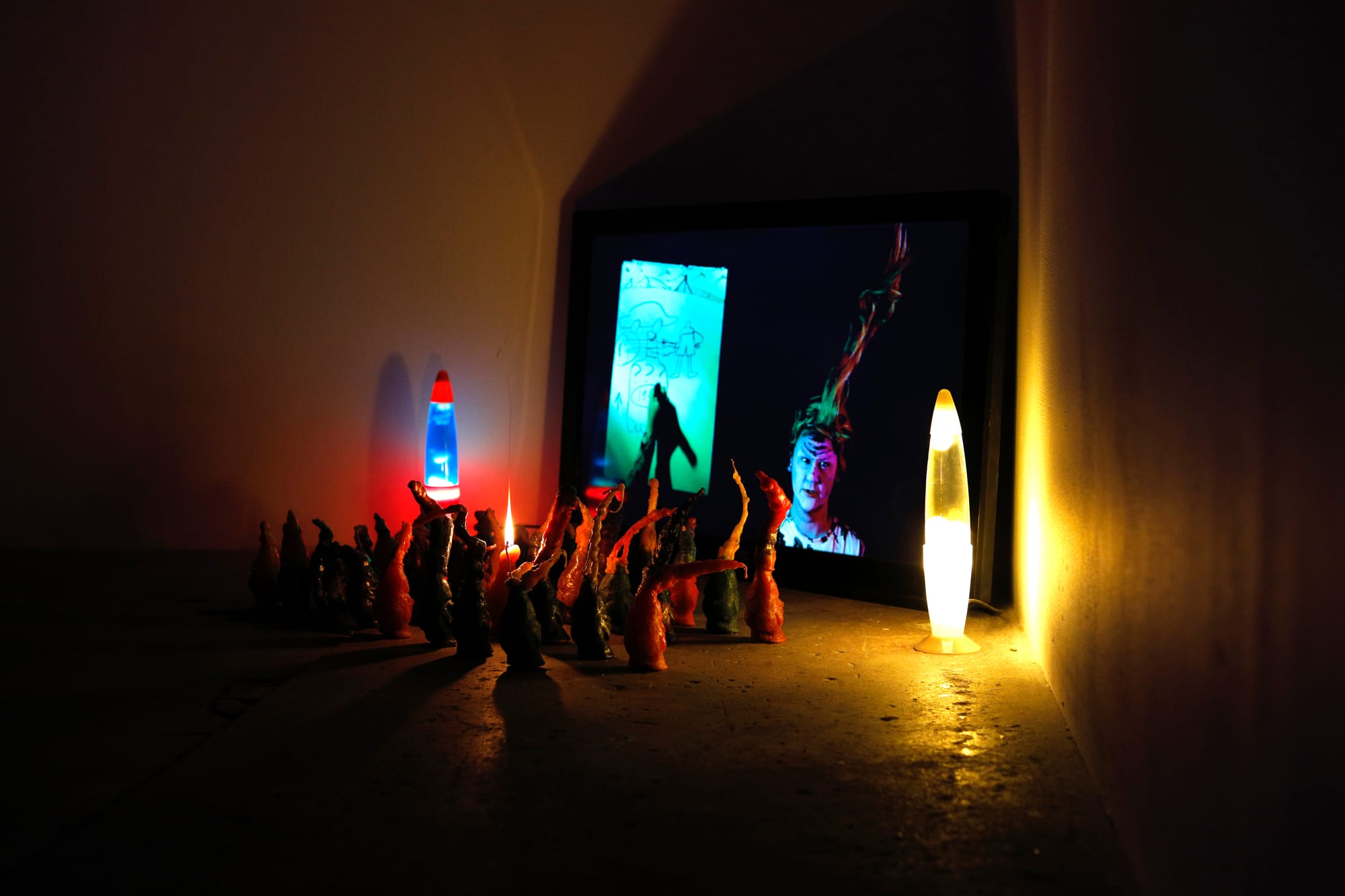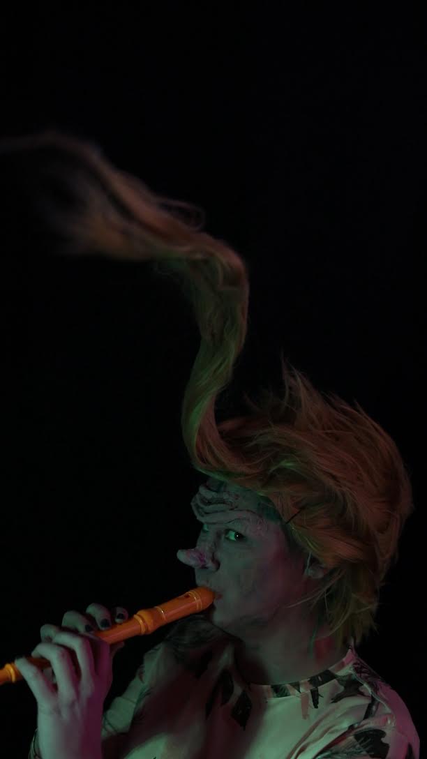 CHICAGO — The chipper song of a recorder may be what lures you into Molly Colleen O’Connell’s exhibition at Julius Caesar gallery, its notes enticing enough to evoke the mysterious Pied Piper. The music plays at the end of a video piece, in which the artist appears in disguise as a troll-like figure, playing the woodwind instrument. To view it, one has to step through a beaded curtain, behind which the video plays in a dark room, in front of tiny wax figures lined up in neat rows. They seem like a little audience of grotesque creatures watching their cult leader perform — a troll army, if you will, huddling in the shadows. They are also candles: they could be set on fire at any moment.