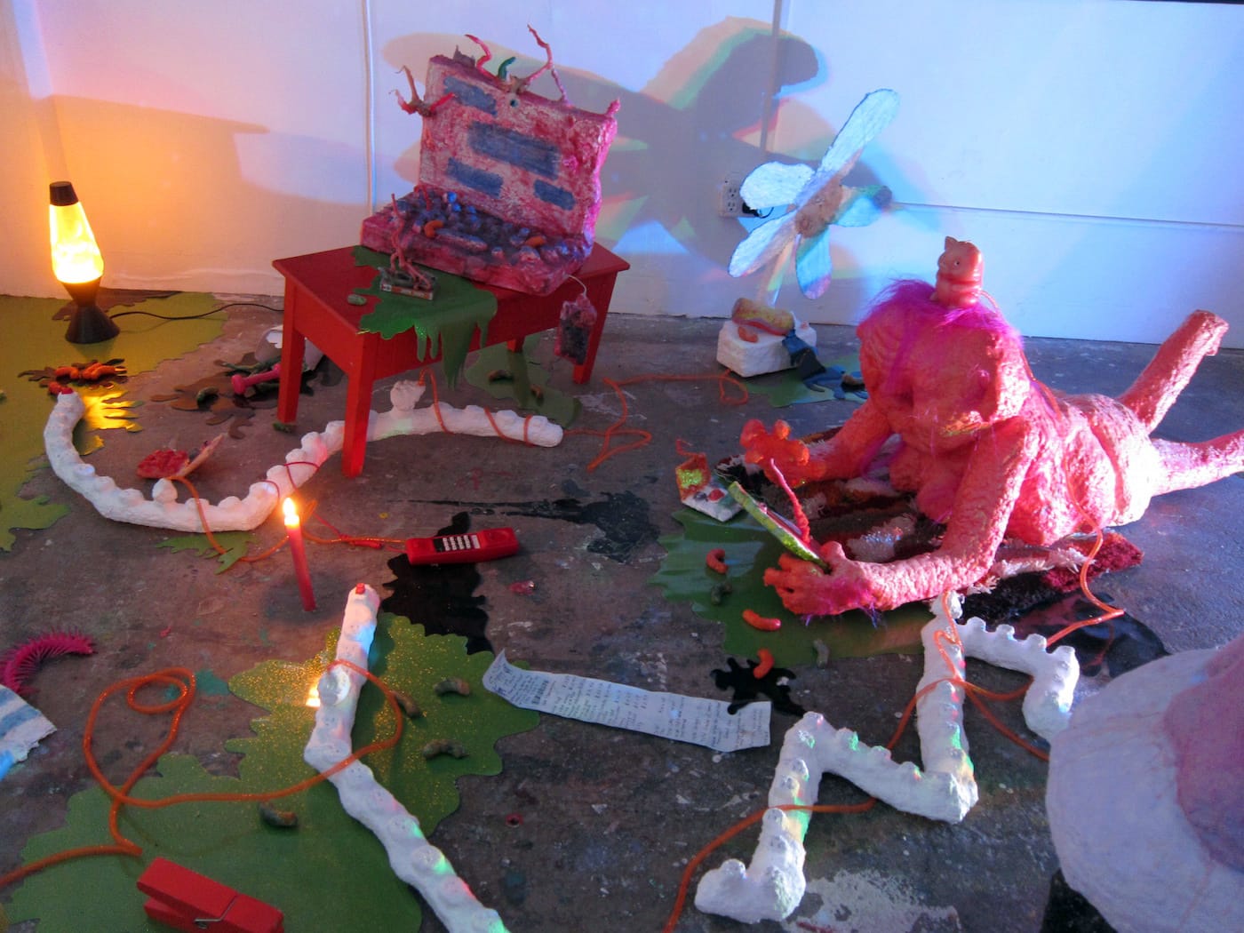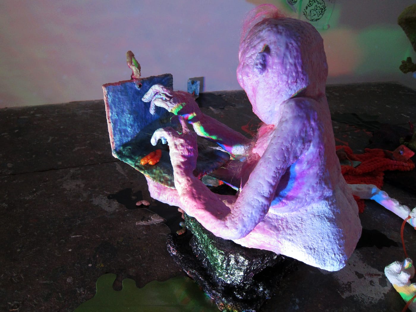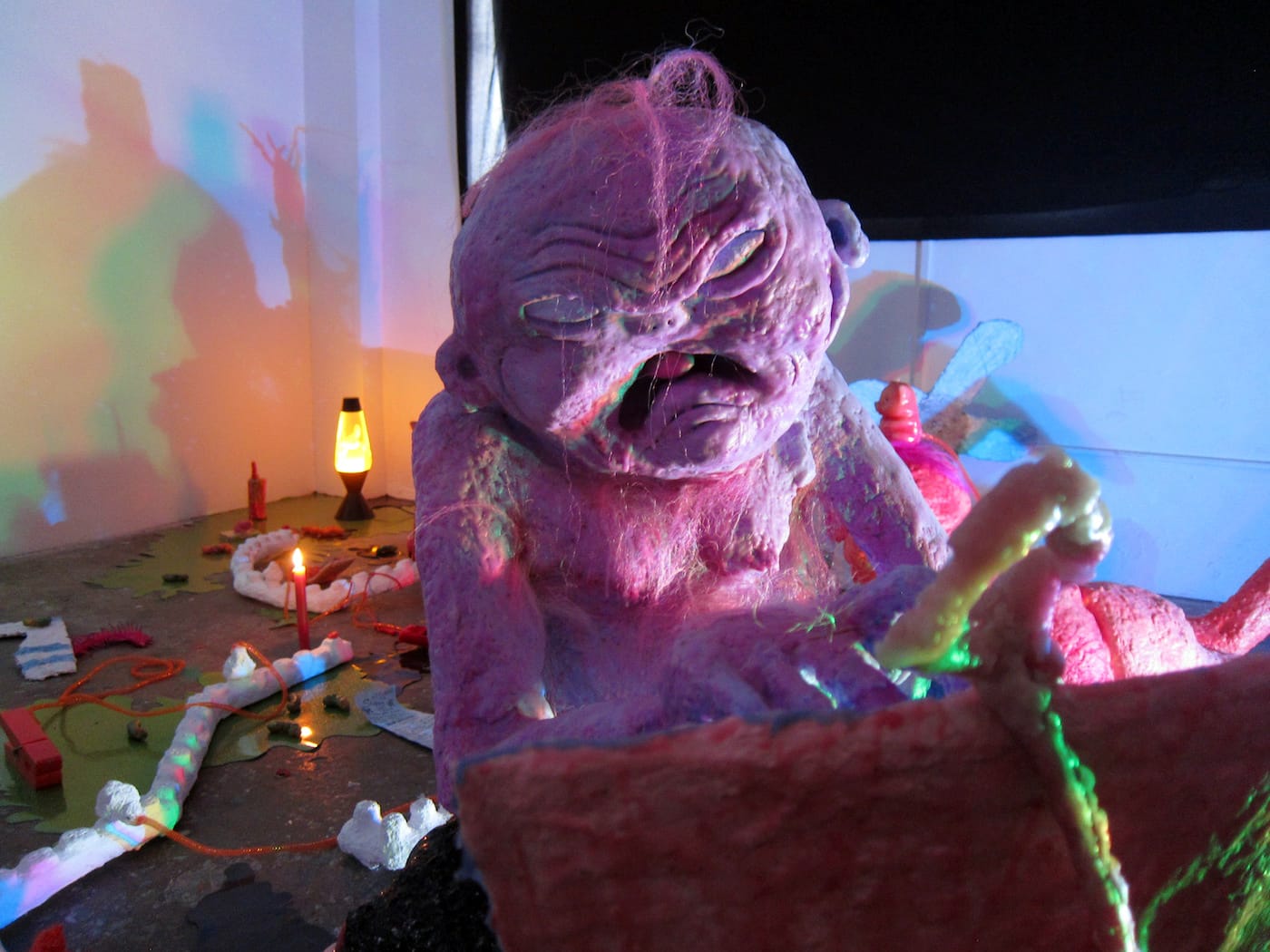 The show’s centerpiece, though, is in the back room, where one encounters an immersive troll lair. Three grotesque, wax-covered creatures sit in a darkened space littered with detritus and lit by lava lamps and colorful stage lights. Scowling with disgust or rage, they are lumpy, balding things who tap on their personal devices. Still, their small size and vivid colors, like those of a troll doll, makes them seem more comical than fearful.