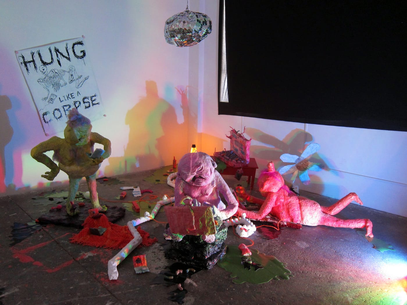 Scattered around the trolls are ephemera that evoke the clutter of a neglected basement bedroom, a netherworld perhaps imagined by teens: sculpted socks and snaking power strips; unhooked landline phones; a Chinese takeout box; Cheetos, which serve as political symbols. Above all this hangs a twisted disco ball, making this a party at which everyone stares at their screens. A true hotspot for trolls, the scene is a tableau of the messy spectacle the internet can be.