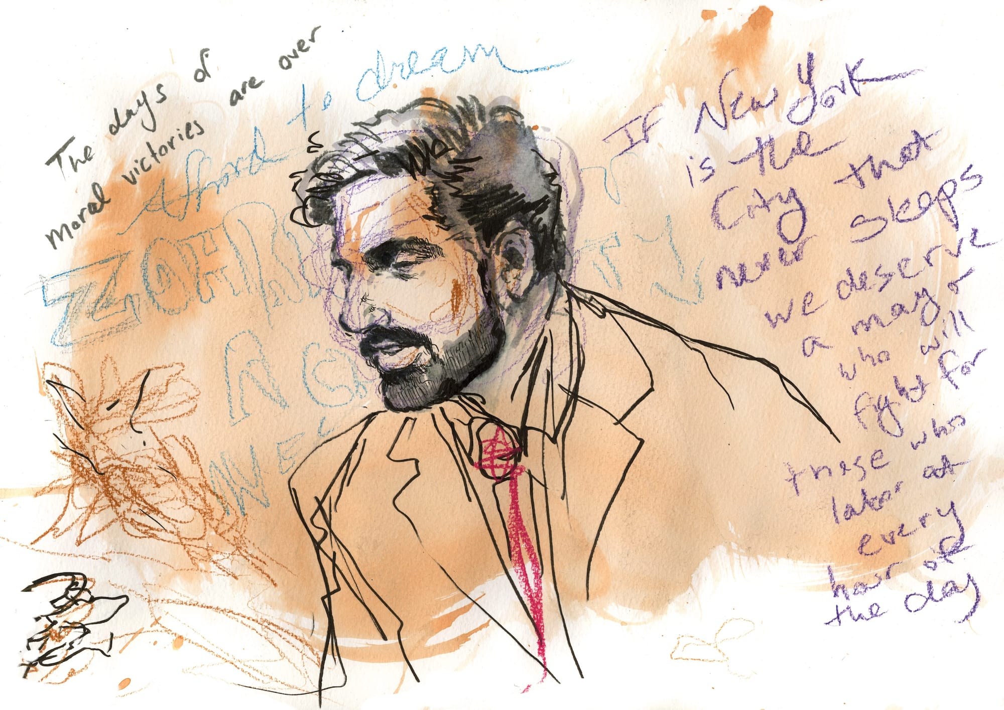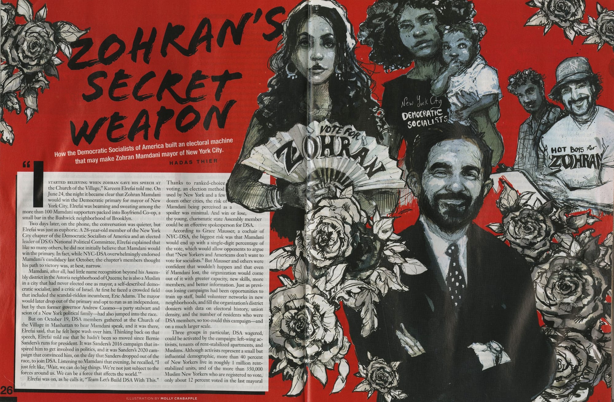 MC: I did that artwork as an illustration for the Nation for an article about his DSA roots. It’s based on a mural that I did in the DSA office, which shows the working people of New York. The Nation art director, Robert Best, asked me to do something inspired by the style of my mural that was about Zohran’s campaign. So I just asked some people I knew — including the amazing Rafael Shimunov, who is the “Hot Boy for Zohran,” he’s a buddy of mine — to pose with their Zohran swag, and then I drew him in the center of it. It’s very much in line with the article, which talks about him as a committed Democratic Socialist and someone who is not creating a campaign that's solely about himself, but rather that is about and comes out of a movement.