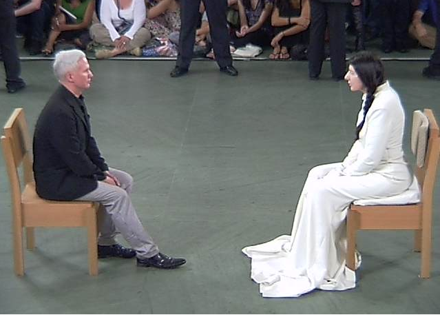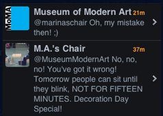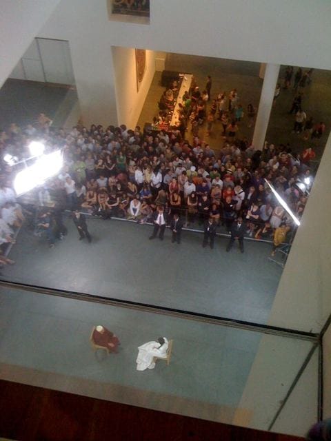 Then there were the more dramatic moments on the last day, like the person who vomited at the performance (a form of critique?), the woman who stripped down in front of the artist (and was removed), and the person who threw fliers critical of the performance from the balcony — all of these were reported by Gawker in excruciating detail. Hell, there was even the renegade twitterfeed @marinaschair, which kept things interesting and light — though things started to get surreal when Marina’s chair began to virtually chat with the MoMA itself. Let’s say this whole thing was social media’d up the fuckin’ wazoo. The only thing they didn’t do was create a real Foursquare badge or document her gastrointestinal functions — though one online pundit did propose a theory.