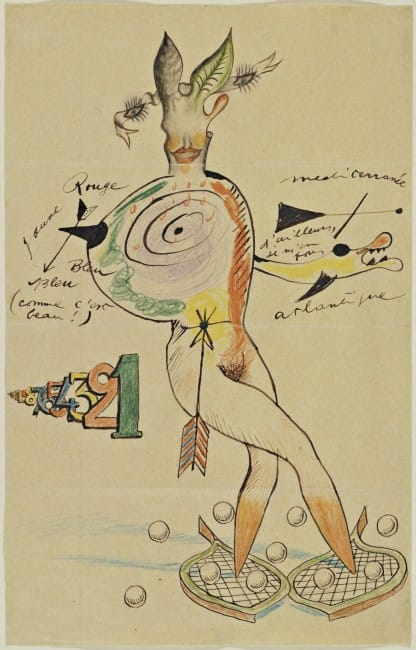 While the original Surrealist material is the highlight, the exhibition was augmented by drawings that appeared informed by the playfulness of collaborative drawings. My personal favorite was Miró’s “Drawing – Collage” (1936), which featured an adorable little duck decal on a fairly outrageous drawing of a hermaphrodite. This is an example of playing with gender way before post-structuralist philosopher Judith Butler was even born. Miró’s simultaneously male and female drawing is a cute play on sexuality and innocence.