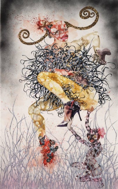 After studying some of the older material, I was a little less interested in the contemporary work on display. A Robert Gober work of a tree wearing a dress (even with my personal amusement at its possible allusion to the Nick Cave and the Bad Seeds song “Say Goodbye to the Little Girl Tree“) unquestionably pales in comparison to the detailed, feverish lines of Bellmer or Dalí. But yet there is still some recent work that fascinated me like Wangechi Mutu’s collage by the entrance to the exhibition. Her use of color and movement through collage still retains some of the pieced together bodies typical of the exquisite corpse and appeared to be a good fit.