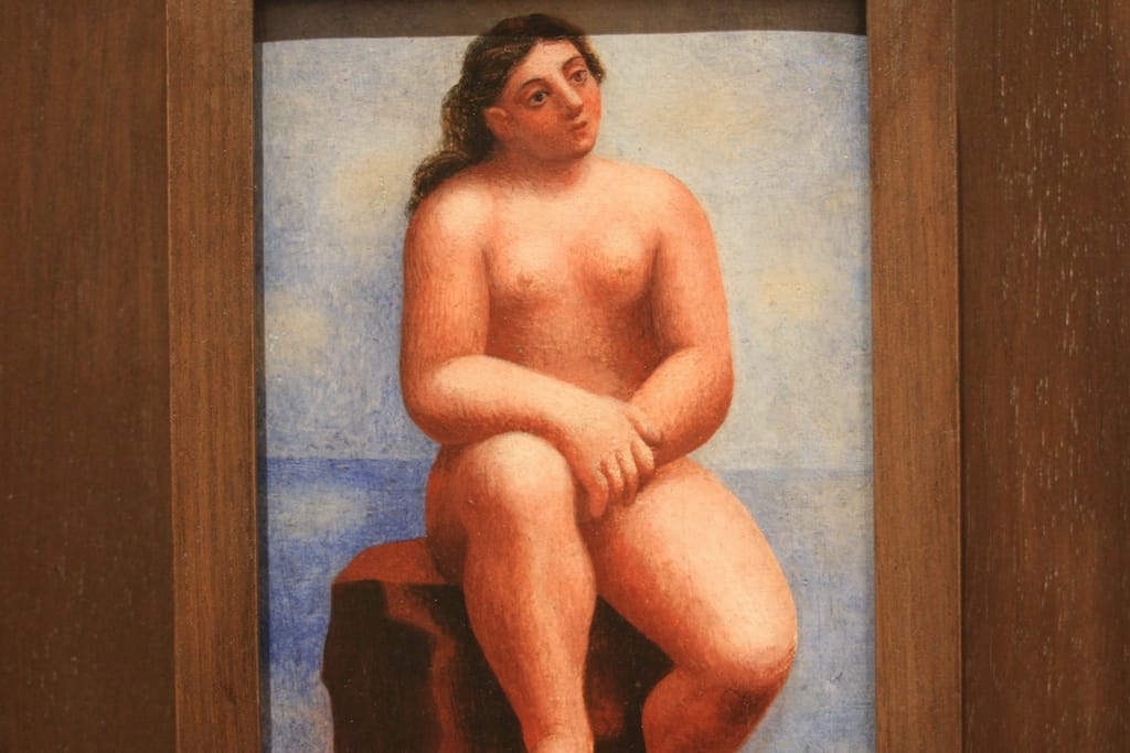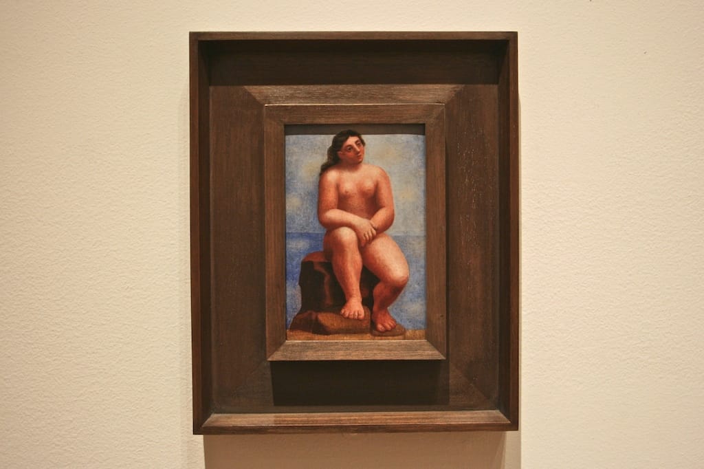 From a ways off, no visitor would really expect anything big out of “Nude Seated on a Rock”, a tiny object mounted on a side wall in a gallery full of striking Picasso canvases. See the photo of the piece in situ at top. Nothing much, right? But get a little closer and an entire world becomes visible, a sky rendered in pale blues and white, mottled and hazy like a humid beach on the Mediterranean coast, the horizon a split between the darkness of the water and the light of the sky. Picasso’s model sits on a nondescript rock outcropping against the barest hint of ground, with the land foreground crashing against the blue background. The muted glow of the painting’s light might be from an evening sunset, or maybe an early morning sunrise. It’s a time and place that can’t be pinned down, and this anonymity gives rise to the painting as an archetype, a universality that shares a timelessness with Cezanne’s bathers.