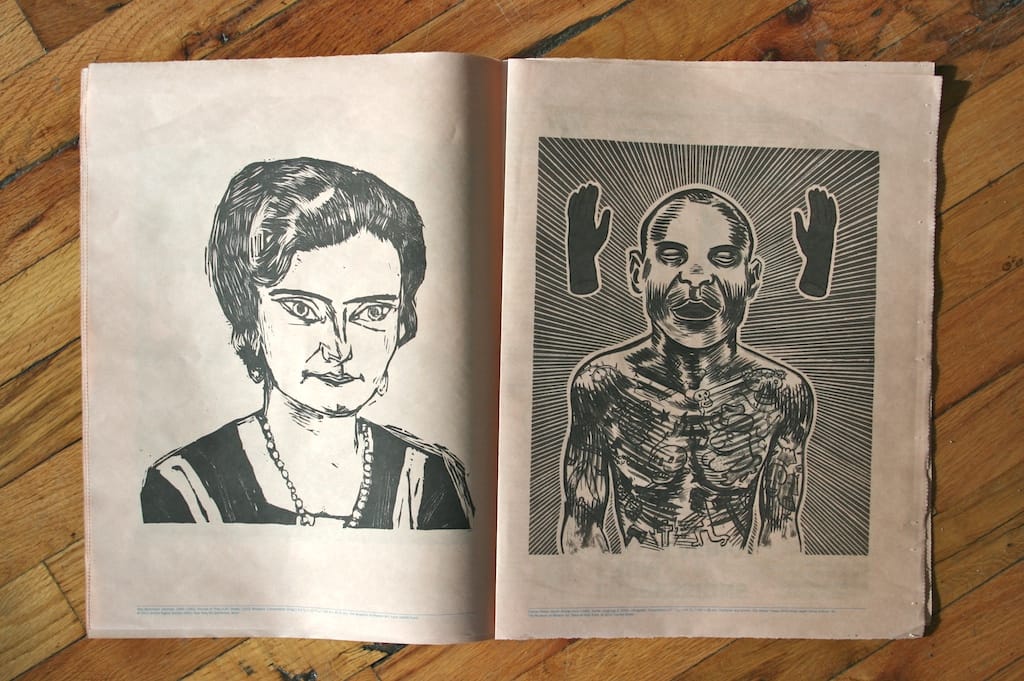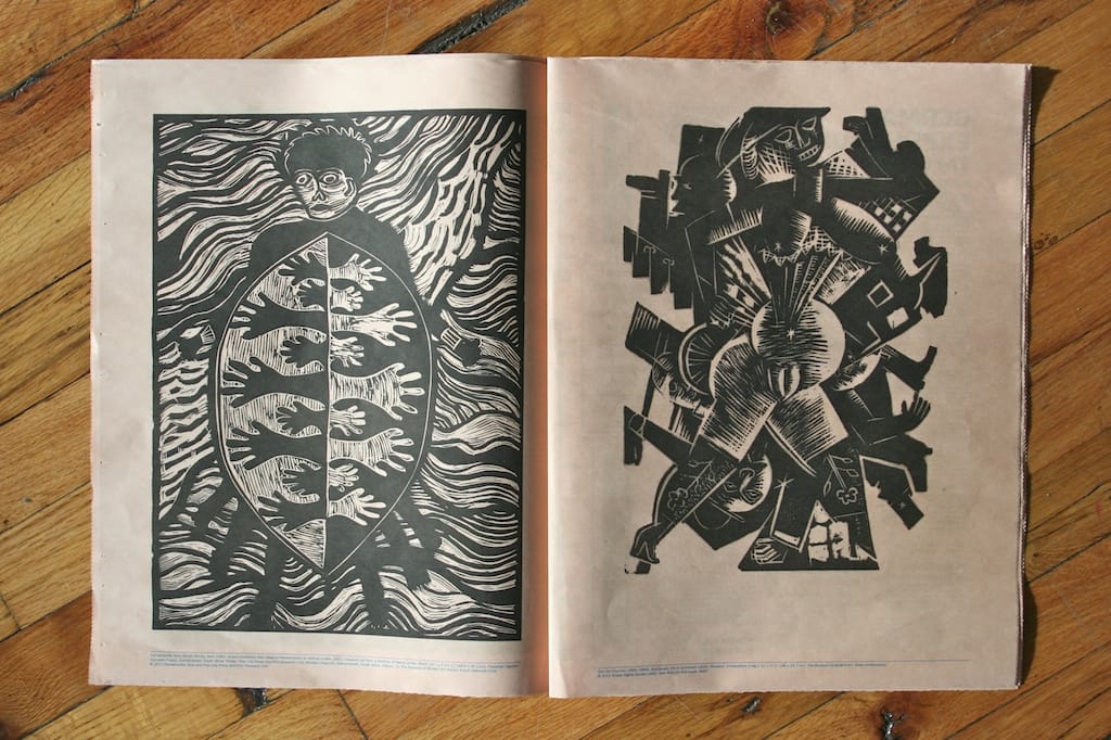 Impressions From South Africa‘s broadsheet section features a striking selection of prints from the exhibition, beginning with Sandile Goje’s “Meeting of Two Cultures” (1993), a two-page spread linoleum print with an anthropomorphized African shaking hands with a more western dwelling. The rough outlines and cross-hatching of the print’s forms relates strongly to the German prints featured on the other side of the broadsheet. “Secret Language II” by Conrad Botes presents a front-on view of a male human figure covered in tattoos, flanked on either side by disembodied hands. It’s a sneakily strong print, a confrontational visage made more immediate by the ephemeral quality of newsprint and the contrast of dark on white.