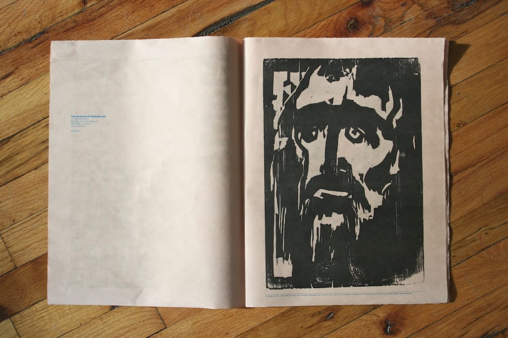 Pick up MoMA’s broadsheet and you’ll first have to pick a side to open it from. Where you start determines which exhibition you’ll see; do it wrong and you’ll be looking at the prints upside down. The German Expressionism side kicks off with an iconic image: Emil Nolde’s “Prophet” from 1912. Reproduced on the broadsheet’s newsprint, the imperfections of the woodblock print — bare spots, scratches, wood grain — pop out even more, like Nolde had just pulled the sheet off an inked block. It also helps that the prints are reproduced at close to original sizes as well; every detail is crisp and clear.