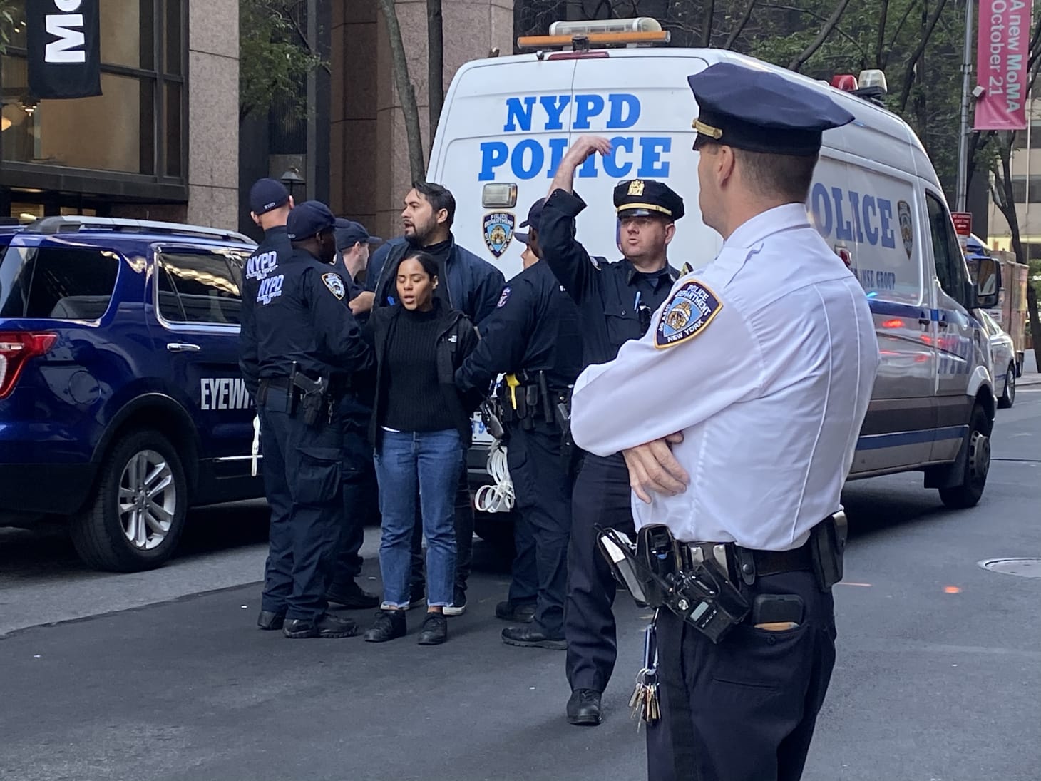 After a series of addresses at the museum’s entrance, the protests staged a sit-in on 53rd street, blocking the street for traffic. NYPD officers warned the protesters that they would be arrested and charged with disorderly conduct if they don’t move to the sidewalk. Seven activists who refused to disperse were handcuffed and taken into a police car.
