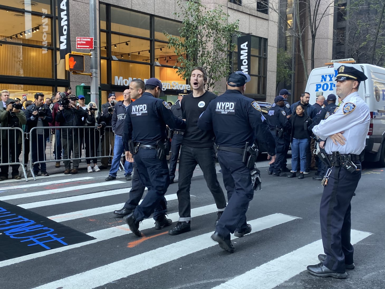 Protesters blocking MoMA’s 53rd street entrance.