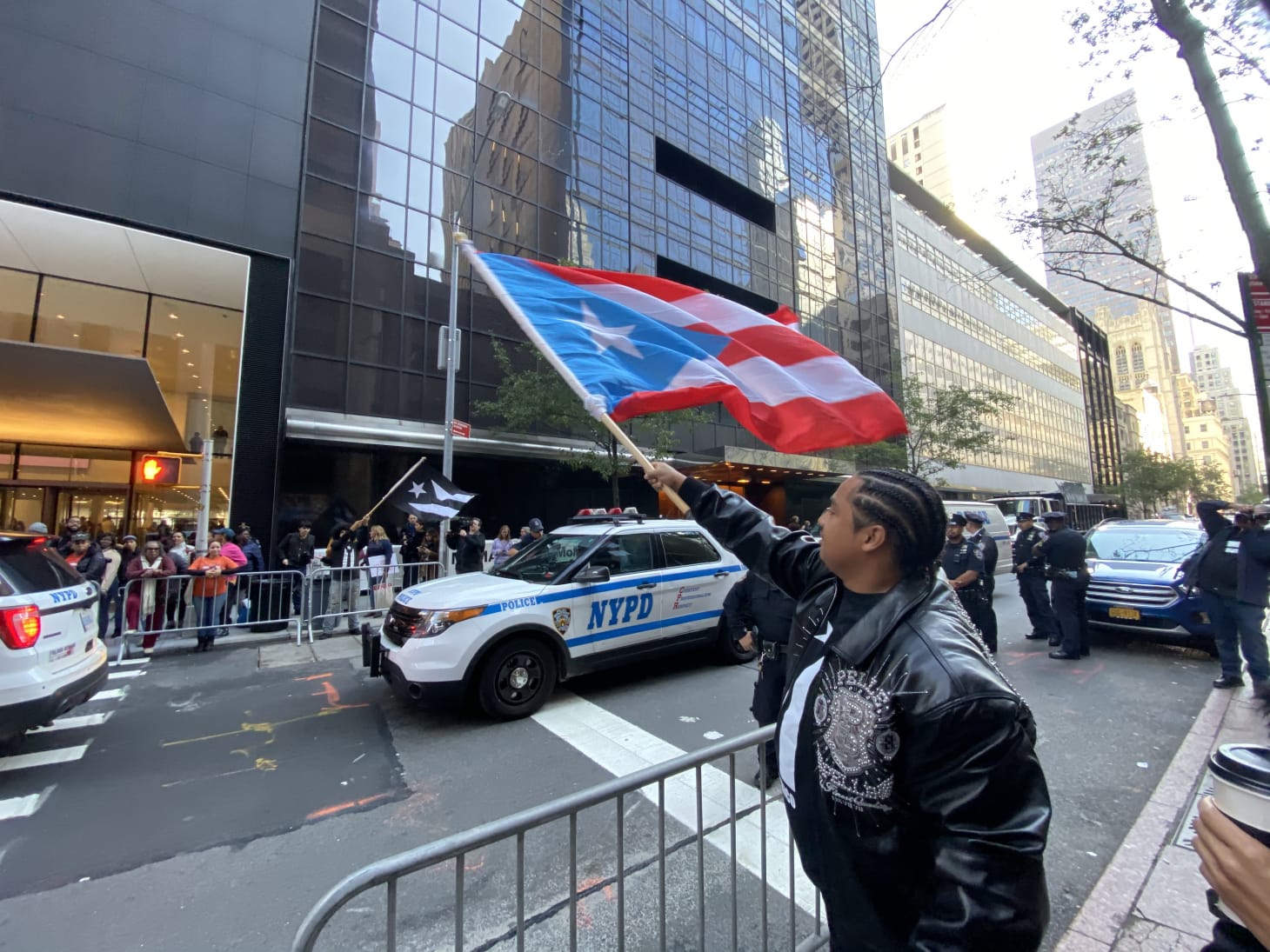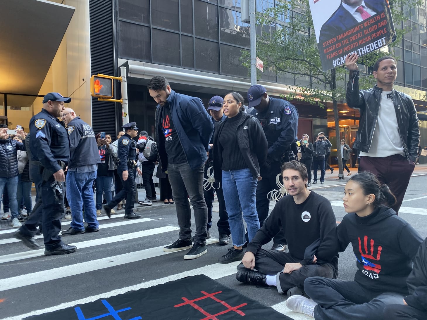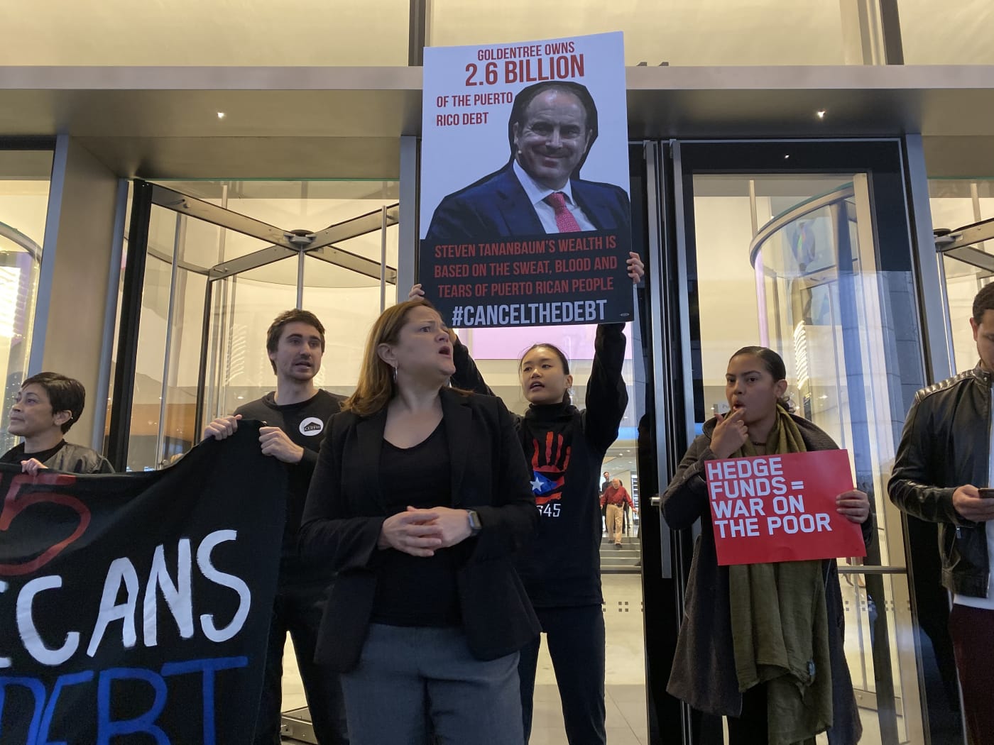 Two protesters who were on the sidewalk spoke with Hyperallergic after the arrests. “Tananbaum went on a buying spree from October 2017 to April 2018 when we were in our recovery crisis directly after the hurricane, and purchased the majority of those distress bonds,” Inaru Guara, a member of Cancel the Debt, said. “He knew exactly what he was doing and he’s profiting from it till this very day.”