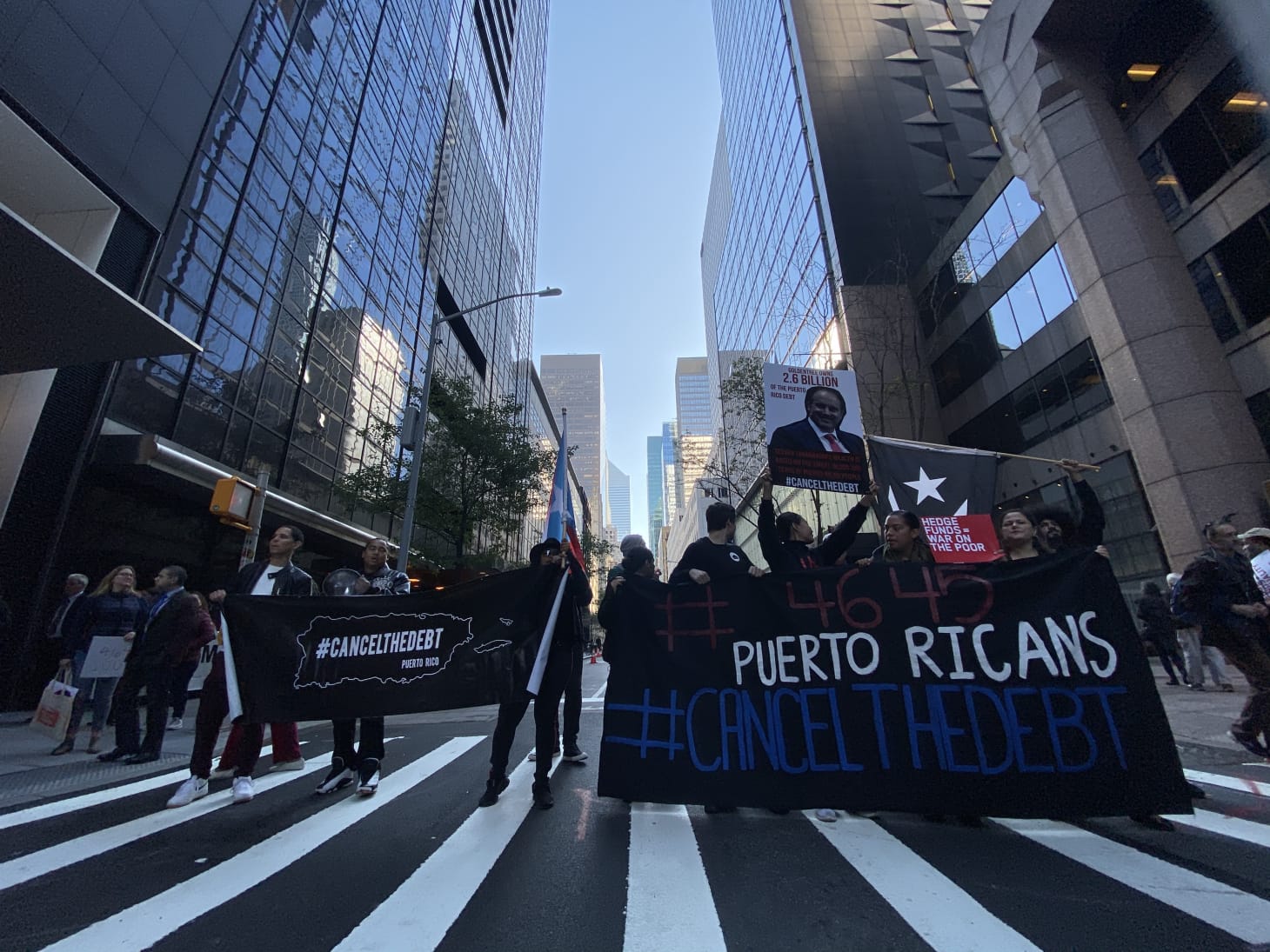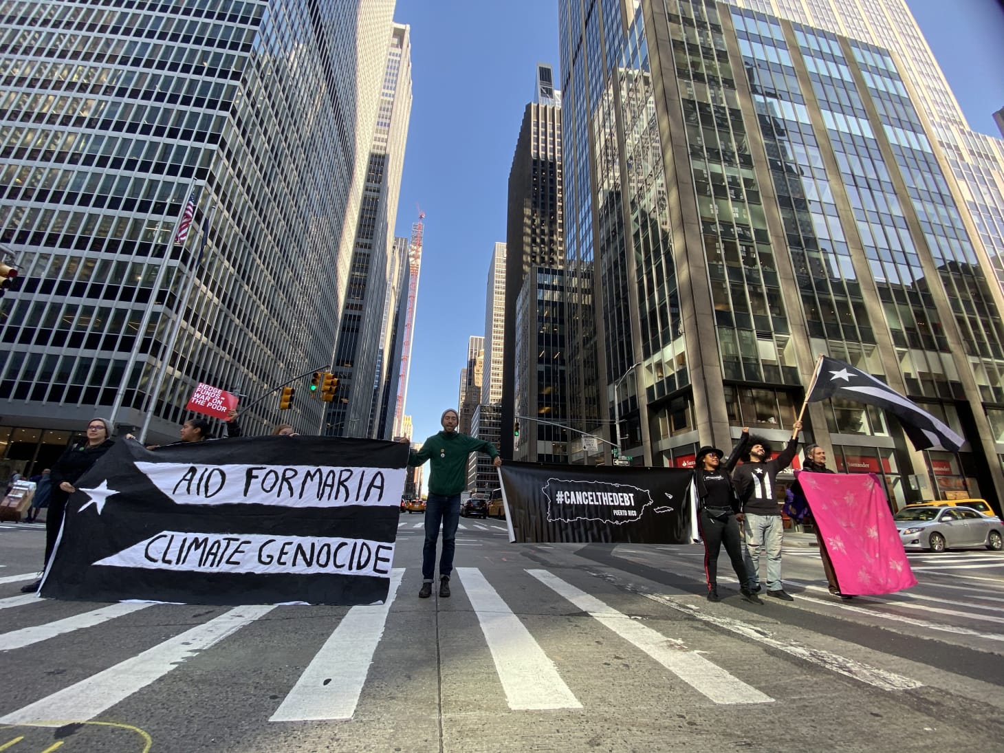 Cancel the Debt and Extinction Rebellion activists blocking traffic at 6th Avenue and 51st Street.