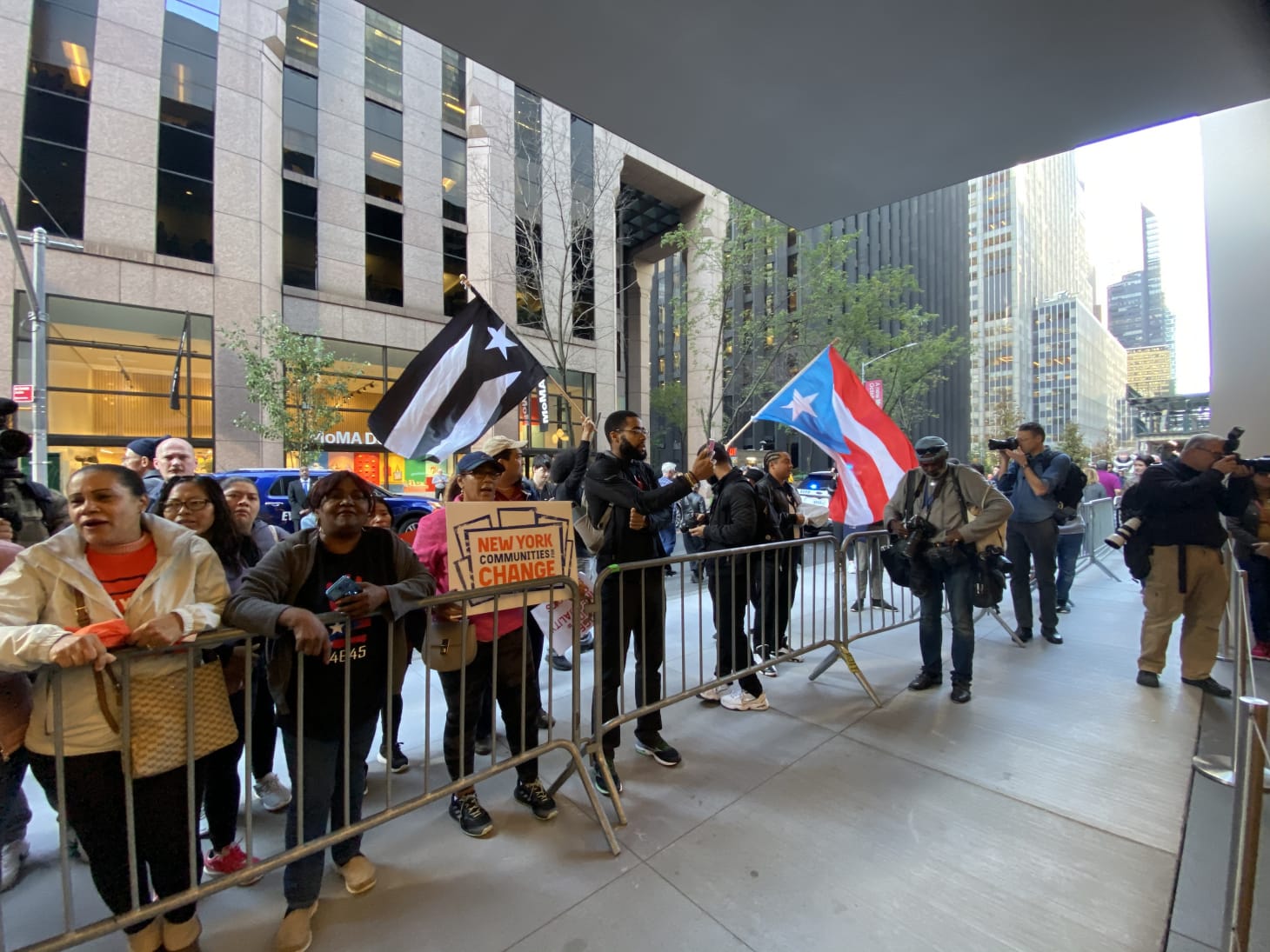A long line of patrons trailed outside the museum, as the museum’s security and the New York Police Department (NYPD) barricaded and guarded the scene. Many of them were tourists who appeared perplexed by the spectacle. “That’s a lot of press for a small group,” said a visitor from Switzerland, commenting on the dozens of photojournalists behind the police barricades. The press was mostly there to cover the museum’s public unveiling before the protest erupted.