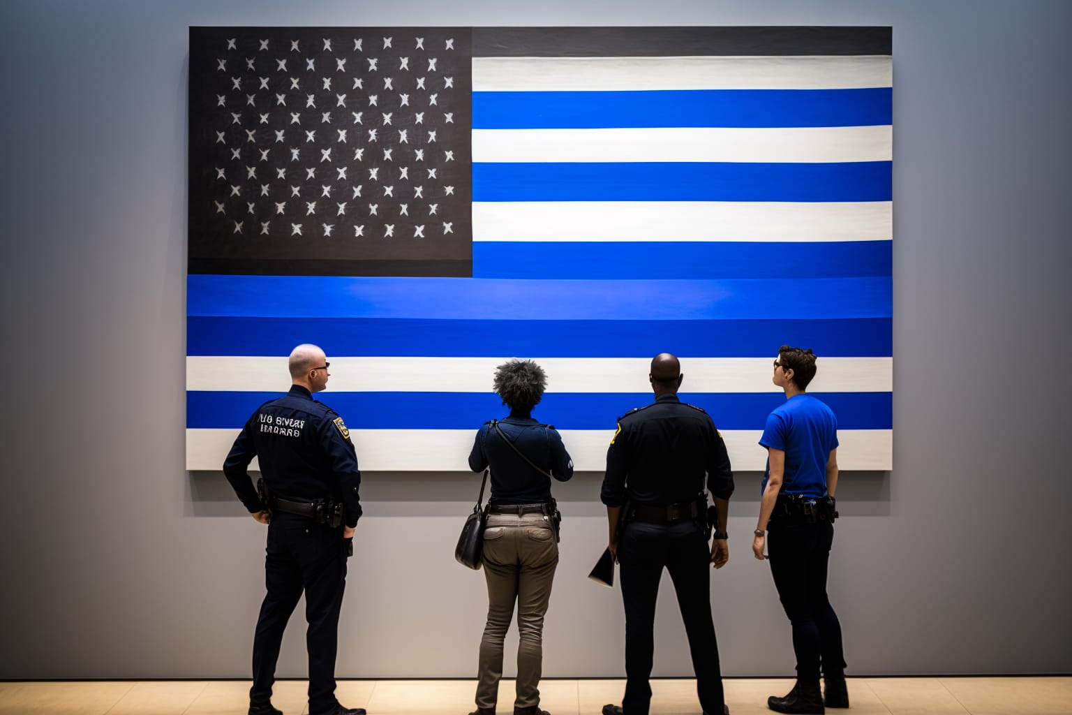 The exhibition offers five new commissions among a rehanging of over a century of contemporary and modern art, including a large painting of the Blue Lives Matter flag that is in dialogue with the long history of appropriation art and a series of digital works that focus on the celebrity of police officers who have gone viral.