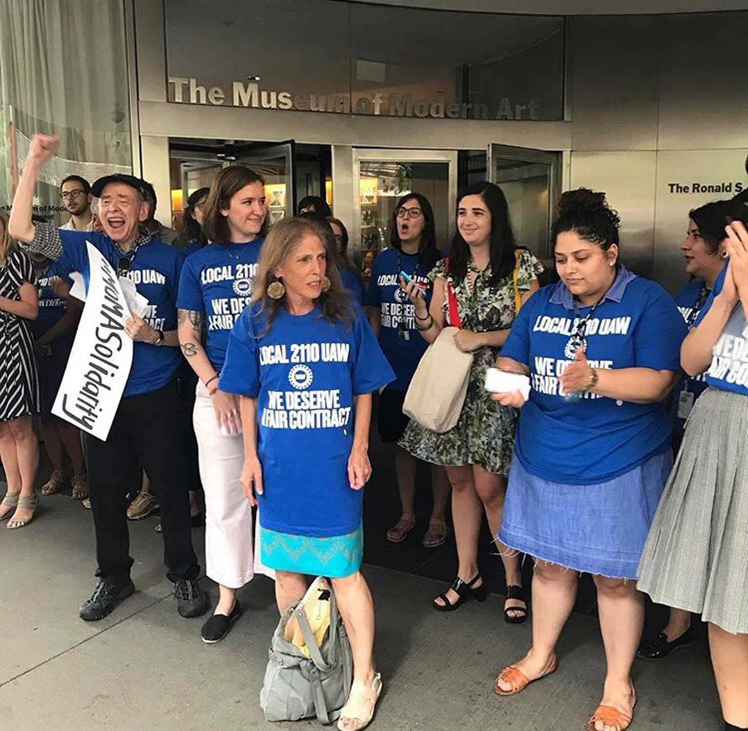 Union members and supporters gathered, brandishing signs reading #WeAreMoMA and #MoMASolidarity. Participants wore t-shirts in the recognizable “UAW blue” that read in bold “LOCAL 2110 UAW/WE DESERVE A FAIR CONTRACT” and congregated to sing the well-known union anthem “Solidarity Forever.”