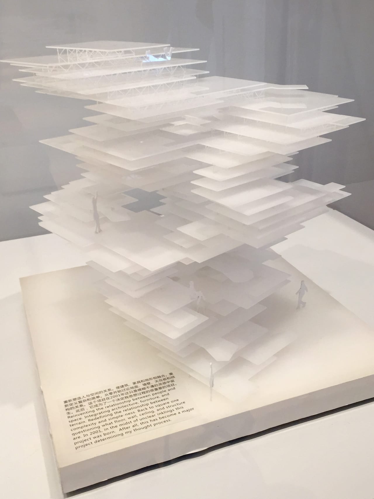 At MoMA, Sou Fujimoto (b. 1971) is represented by such Tokyo projects as his Musashino Art University Museum and Library (2007-1010) and House NA (2007-2011). The building blocks of the former’s multi-chambered, spiraling interior are large, boxy, wooden bookshelf units, while the house substitutes clear glass for exterior walls — the neighbors can see everything — in an irregular, multi-level stack of rectangular “rooms” in a structure that wipes out any inside-outside distinction. In Primitive Future, a book published in 2008, Fujimoto wrote, “I search for an ideal condition of new architecture in-between artifice and nature.”