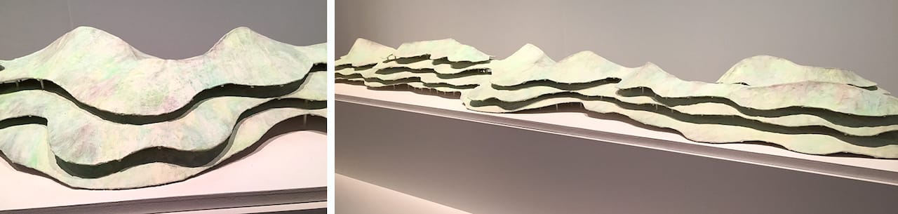 Akihisa Hirata (b. 1971), who worked with Ito in the past and opened his own firm in 2005, and Junya Ishigami (b. 1974), who worked with Kazuyo Sejima & Associates until 2004, are the youngest architects represented in MoMA’s show — and the purveyors of some of the most unusual design ideas on display, including Hirata’s Foam Form project (2011) for the harbor city of Kaohsiung, Taiwan, with its giant net of walkways and plazas suspended over a river. Ishigami’s Port of Kinmen Passenger Service Center, also in Taiwan (begun in 2014), is a grass-and-tree covered, hilly form that reproduces and blends in with a coastal region’s mountainous landscape. Ishigami is also keen on structures that are built in — or rather dug out of or sunk into — the earth.