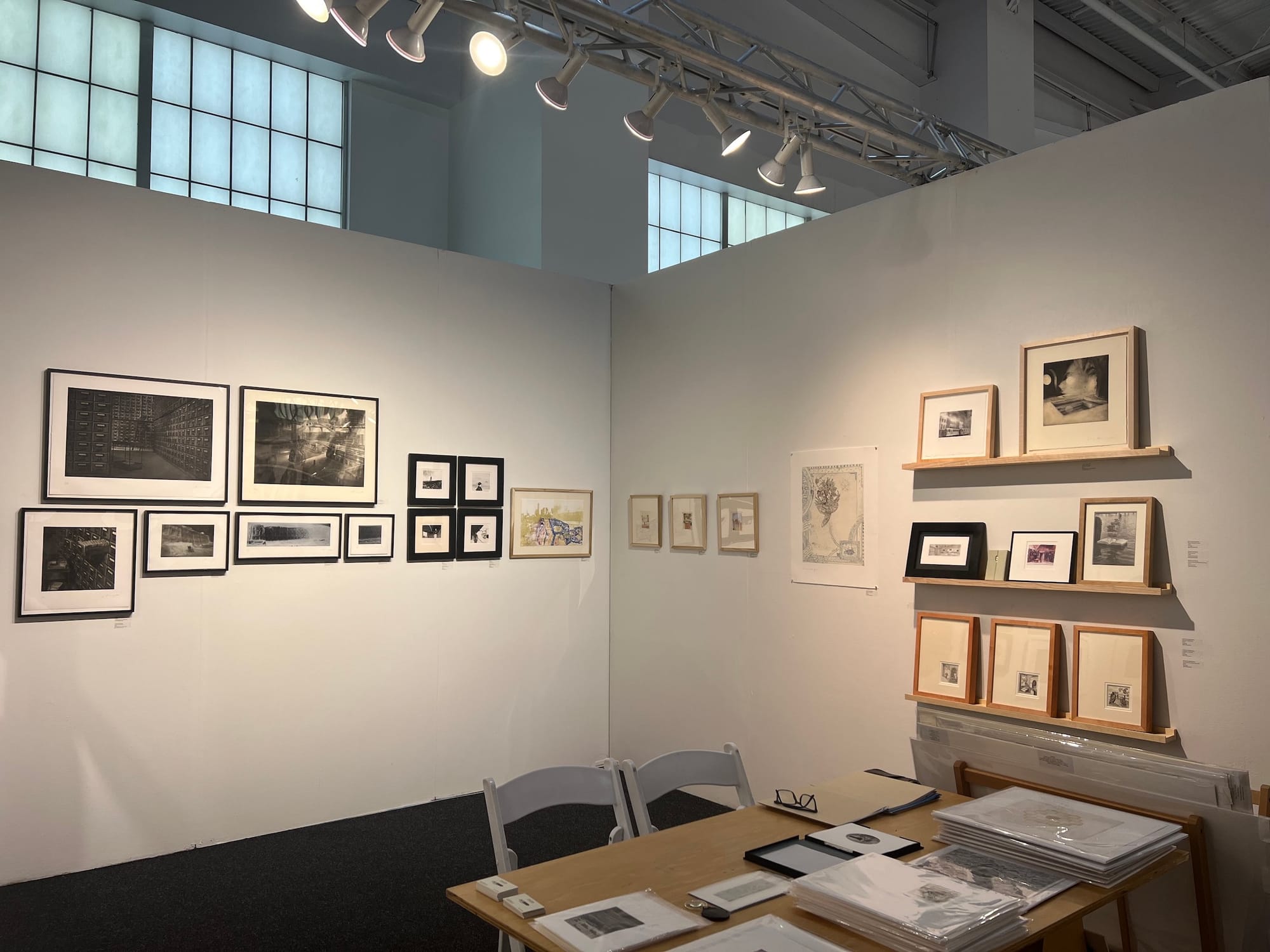 I was also charmed by the tiny prints shown at the Inky Editions booth. I’m a bit like a moth to a lamp when it comes to small-scale work, and the Hudson-based print studio and art collective sent me a torch in the form of miniature etchings, aquatints, and monotypes, as well as a little sculpted room by Lothar Osterburg that’s encased in a box and only viewed through a circular lens.