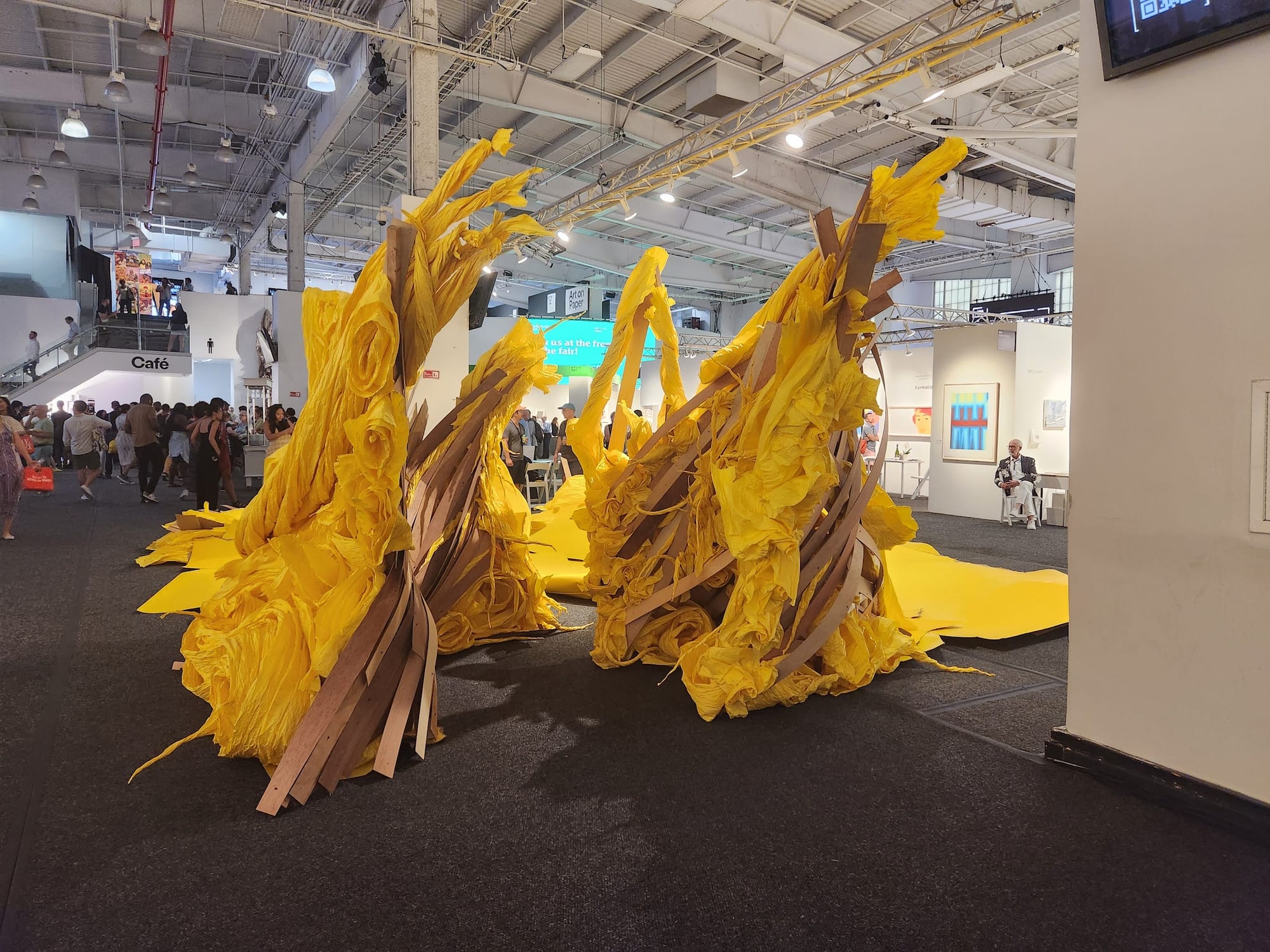 It was a slog to weave through booths of eyeroll-worthy “edgy” text art and run-of-the-mill paintings on gessoed paper, and the worst part is that every lap around the event venue brought me back to this giant installation of warped planks haphazardly covered with twists and scrunches of Kraft-yellow tissue paper that reminded me more of a squirrel’s drey rather than connoting the image of a wildfire. But I was determined to comb through the fair and find some stand-outs nestled between what felt like endless examples of objectively benign but inherently uninteresting wall decor that didn’t warrant a second look and a surprising amount of art that wasn’t on paper.