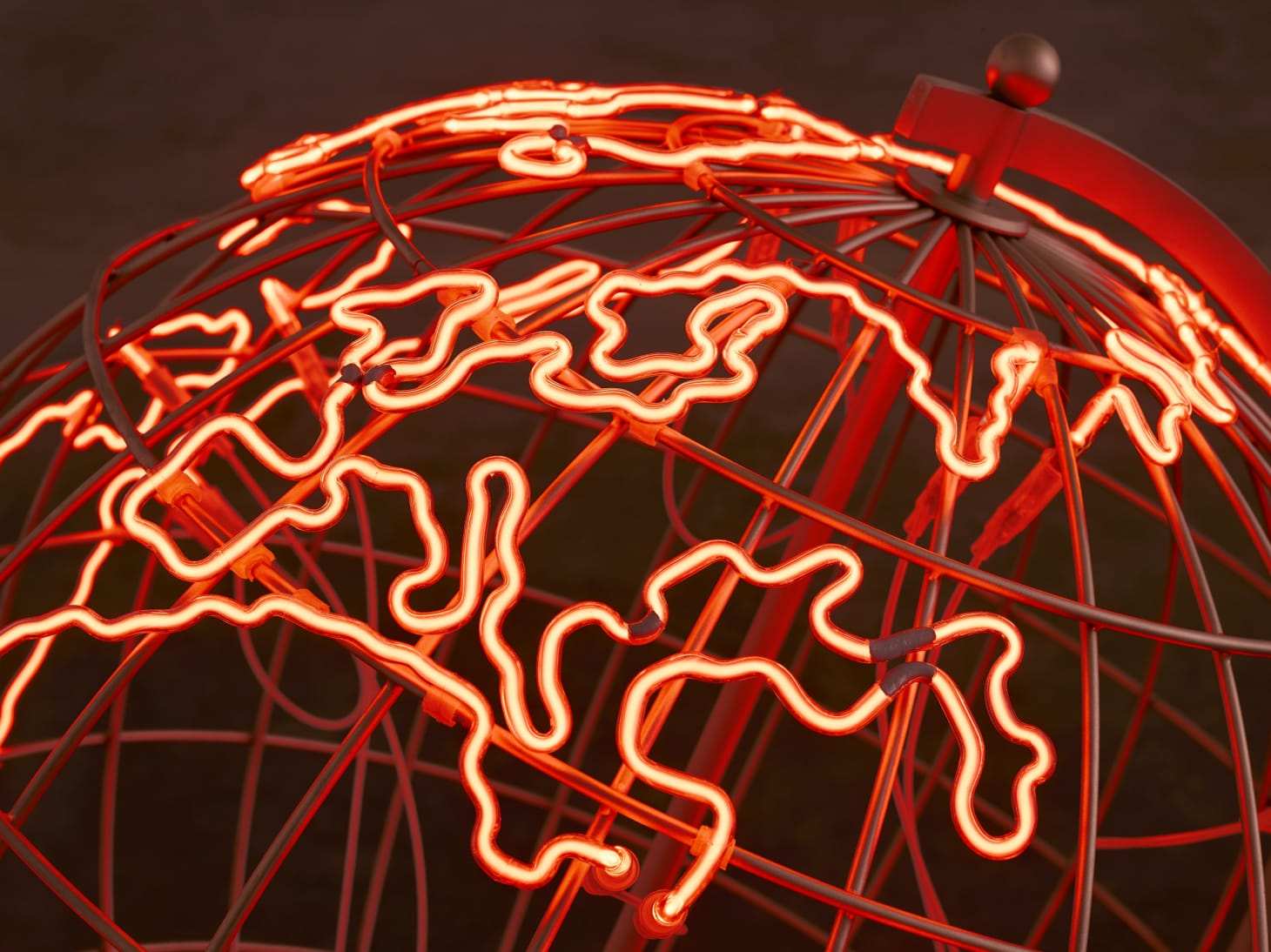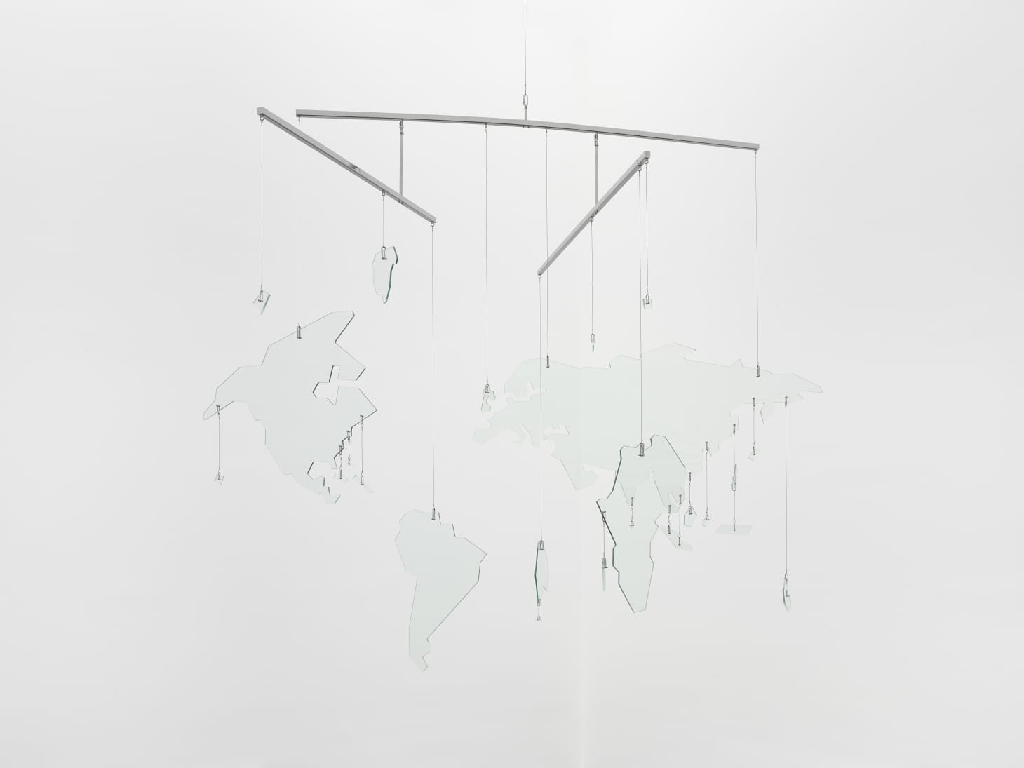 That’s not to say that Hatoum’s works aren’t conceptually rich. They are. In fact, they have a knack for conjuring multiple, often contradictory, meanings. One work that perfectly illustrates this is Map (mobile) (2019), in which Hatoum takes on the Modernist tradition of the mobile (a type of suspended sculpture, pioneered by Alexander Calder and named by Marcel Duchamp). Unlike Calder’s colourful abstract forms, Hatoum’s mobile makes up a map of the world. Maps are tools for structuring, containing and crystallizing space, the tool of conquest and empire. And yet Hatoum’s is constantly in motion, slowly spinning round and round. It is also made of glass — the most transparent and breakable of materials.