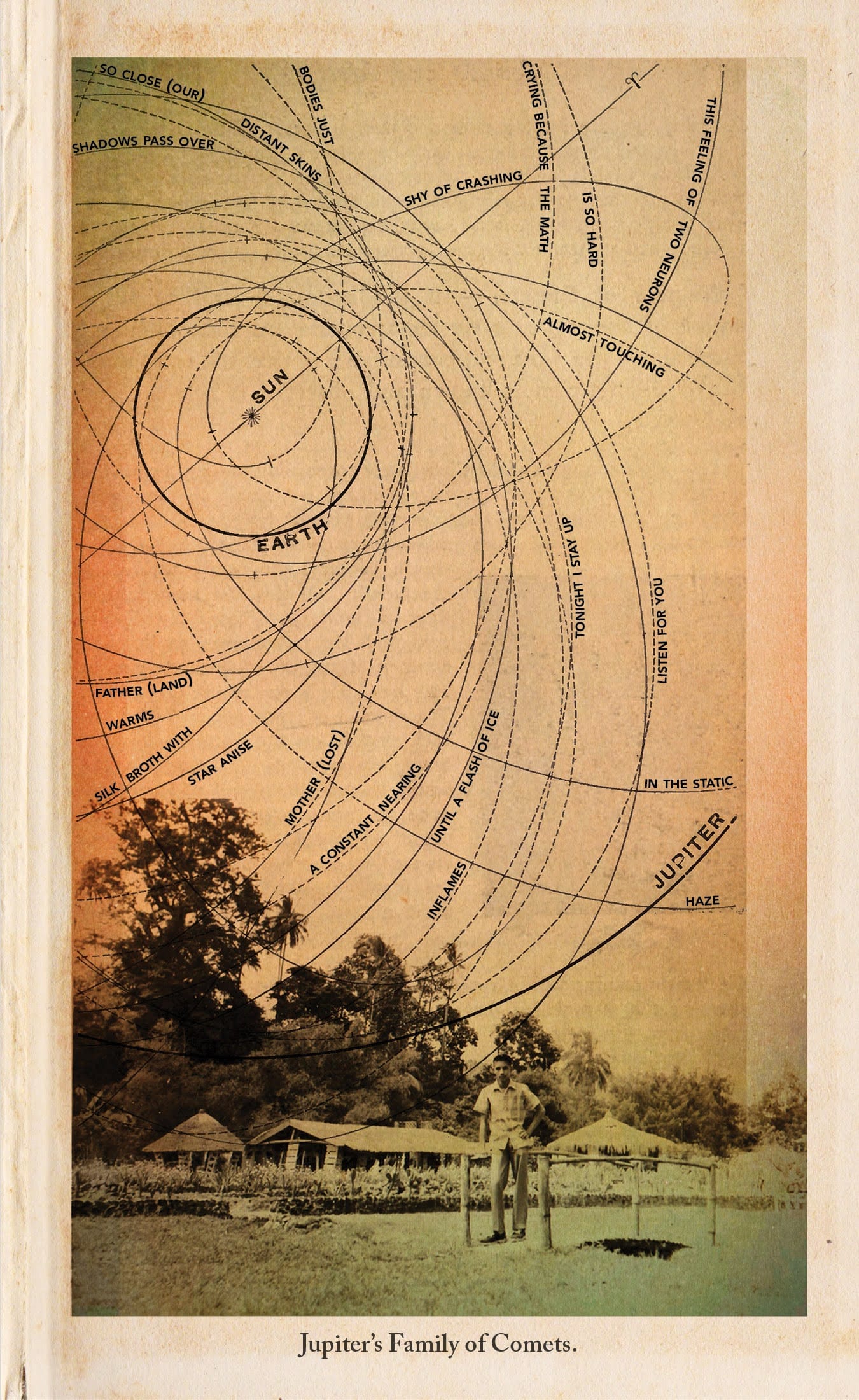 Just as artists develop signature styles and brand themselves, poets develop signature vocabularies, subjects, and technical moves. Ong is not one of them. The language shifts, often in nuanced ways, from project to project. Her merging of the support — be it an astronomical chart or a diagram — with the text is always carefully thought out.