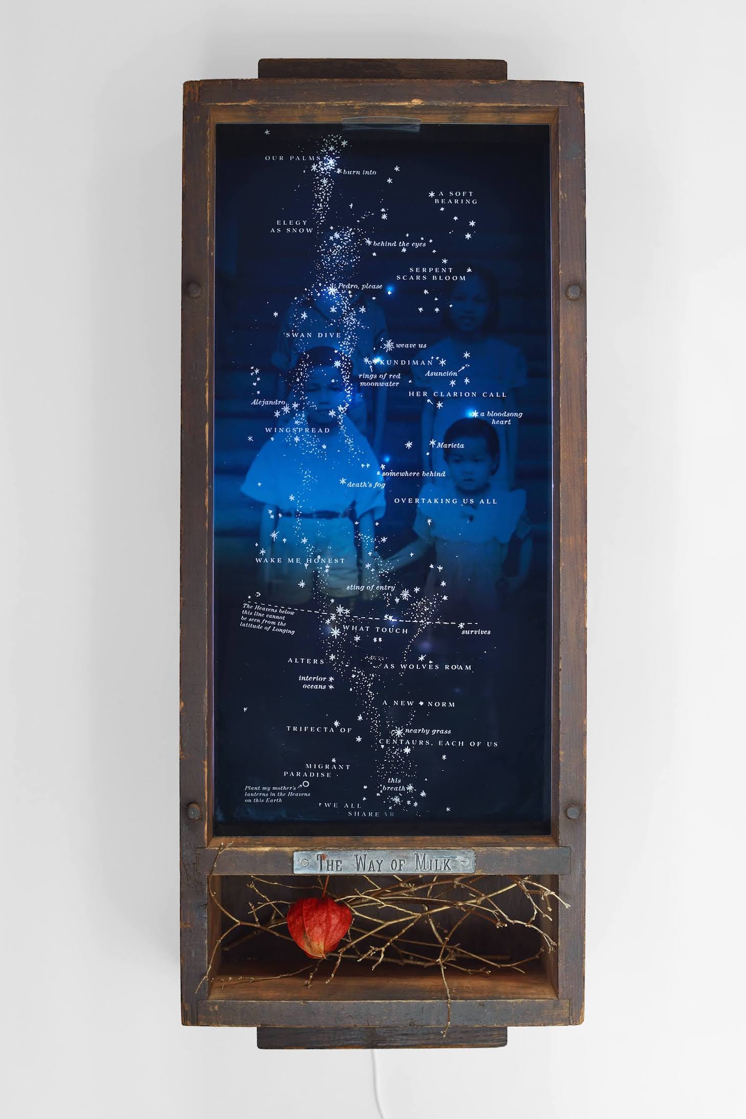 In the light box “The Way of Milk”(2020), Ong has overlaid an image of two pairs of children holding hands with a vertically oriented diagram of a section of the Milky Way that identifies some clusters and some single stars: for instance, “ELEGY AS SNOW” and “MIGRANT PARADISE.” By naming an isolated star “MIGRANT PARADISE,” she suggests something about the yearning and sense of loss and dislocation that is a deep part of the immigrant experience. The union of the four children and the Milky Way enhances but does not enclose that recognition.