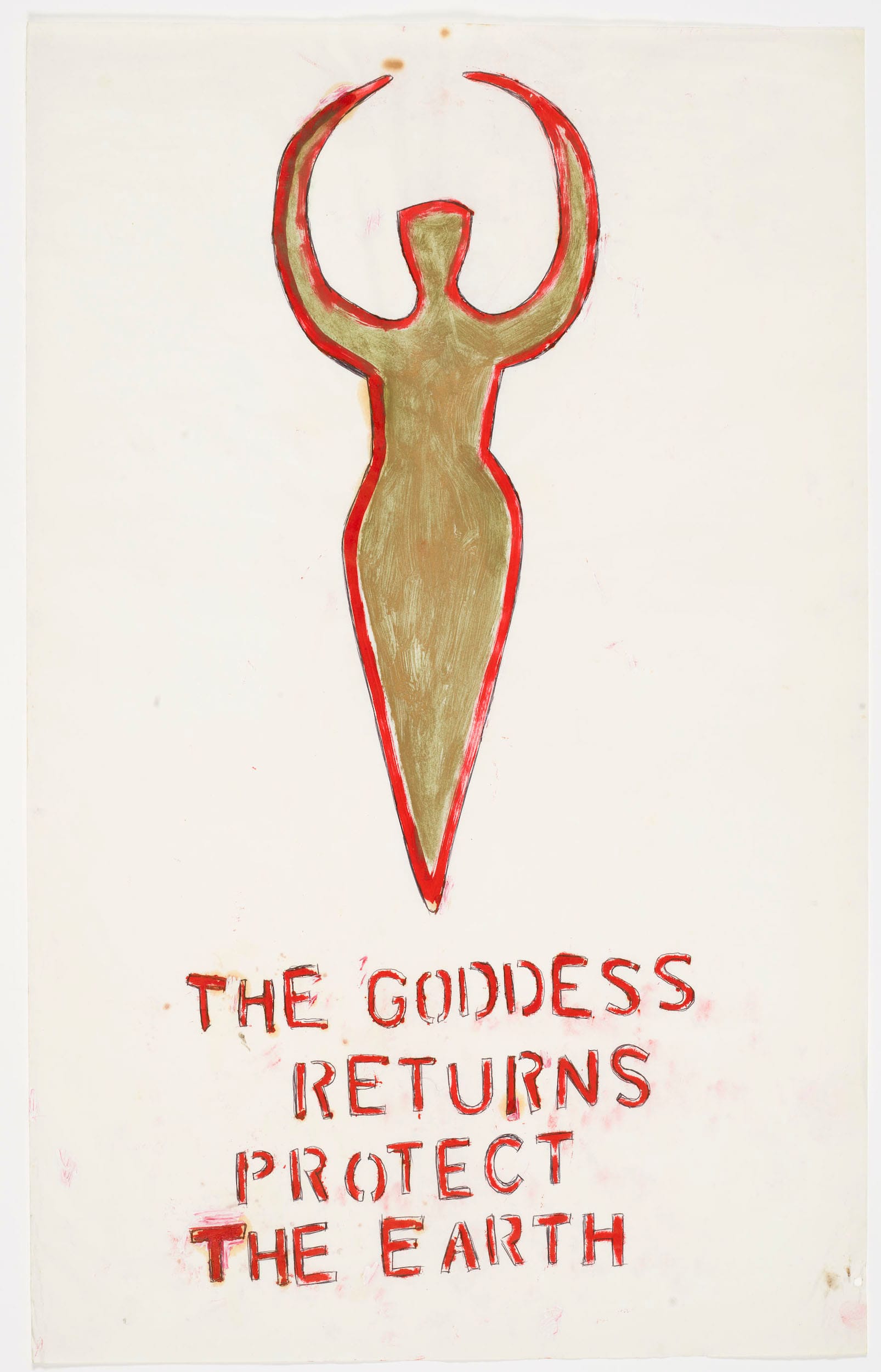 Her later works in particular are simultaneously utopian and tragic, both imagining a matriarchal future and recognizing its impossibility in the face of patriarchal war-mongering and ecological damage. “Mother Earth in Pain, Her Trees Cut Down, Her Seas Polluted” (1996) mourns specific events: the clear-cutting of ancient woodland to create a bypass in Newbury, Berkshire, and a huge oil spill off the coast of Wales. At the same time, it is an expression of pure sadness, created sometime after the premature deaths of both her sons; the Great Mother, armless but with a sun glowing red hot at her womb, turns her face to the sky and cries. She is an everywoman, grieving for the world — and calling on the viewer to help heal it.