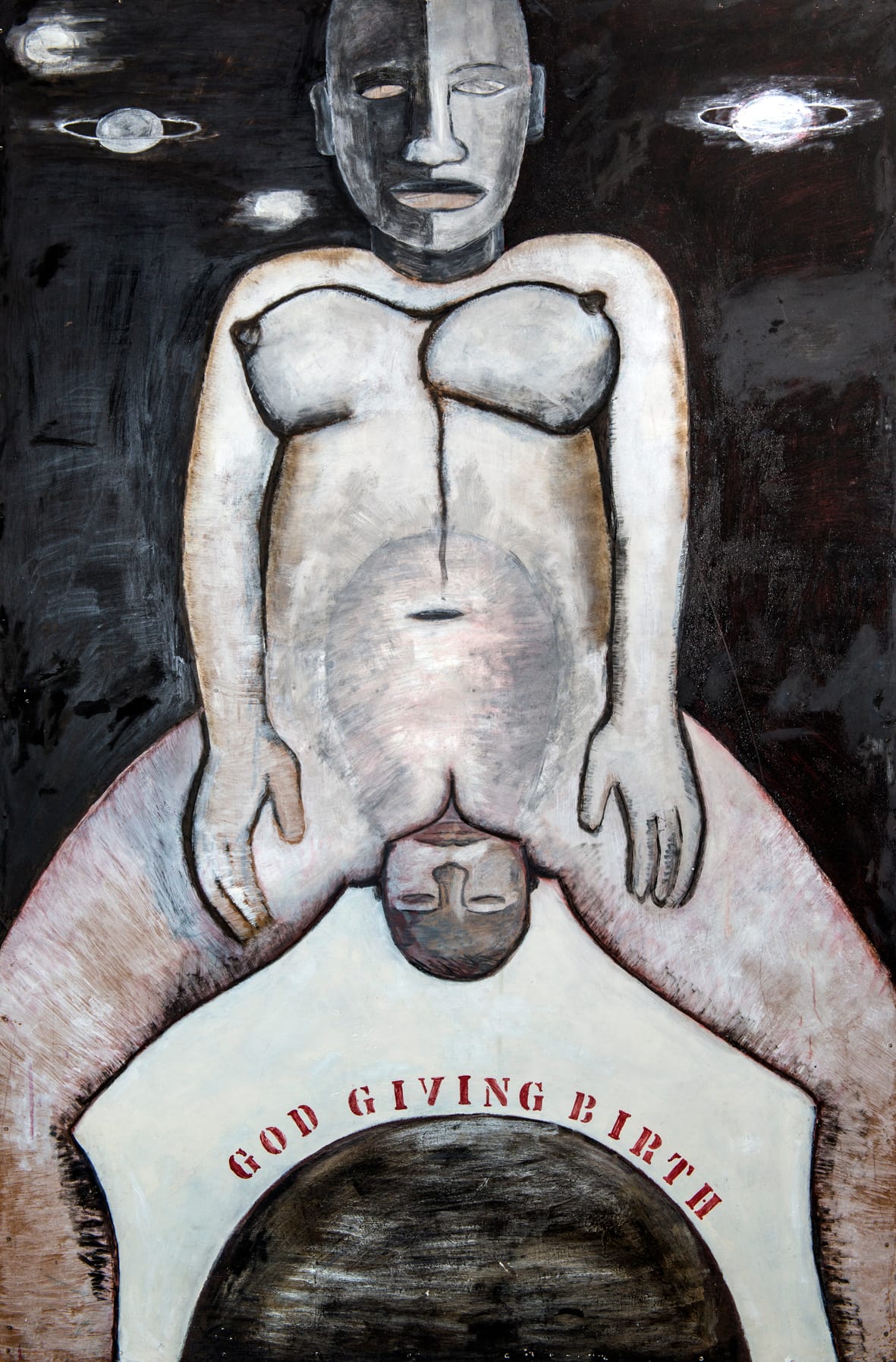 OXFORD, England — “God giving birth.” This phrase, which titles one of Monica Sjöö’s best-known and most controversial works, is written in red capitals across the bottom of the painting. The text, though enigmatic, is a bold challenge to gendered perceptions of divinity, labor, and creation. The androgynous, blank-eyed face both contrasts with and complements the feminine body, in which Sjöö accurately captures the appearance of a contracting uterus and breasts on the verge of lactation.