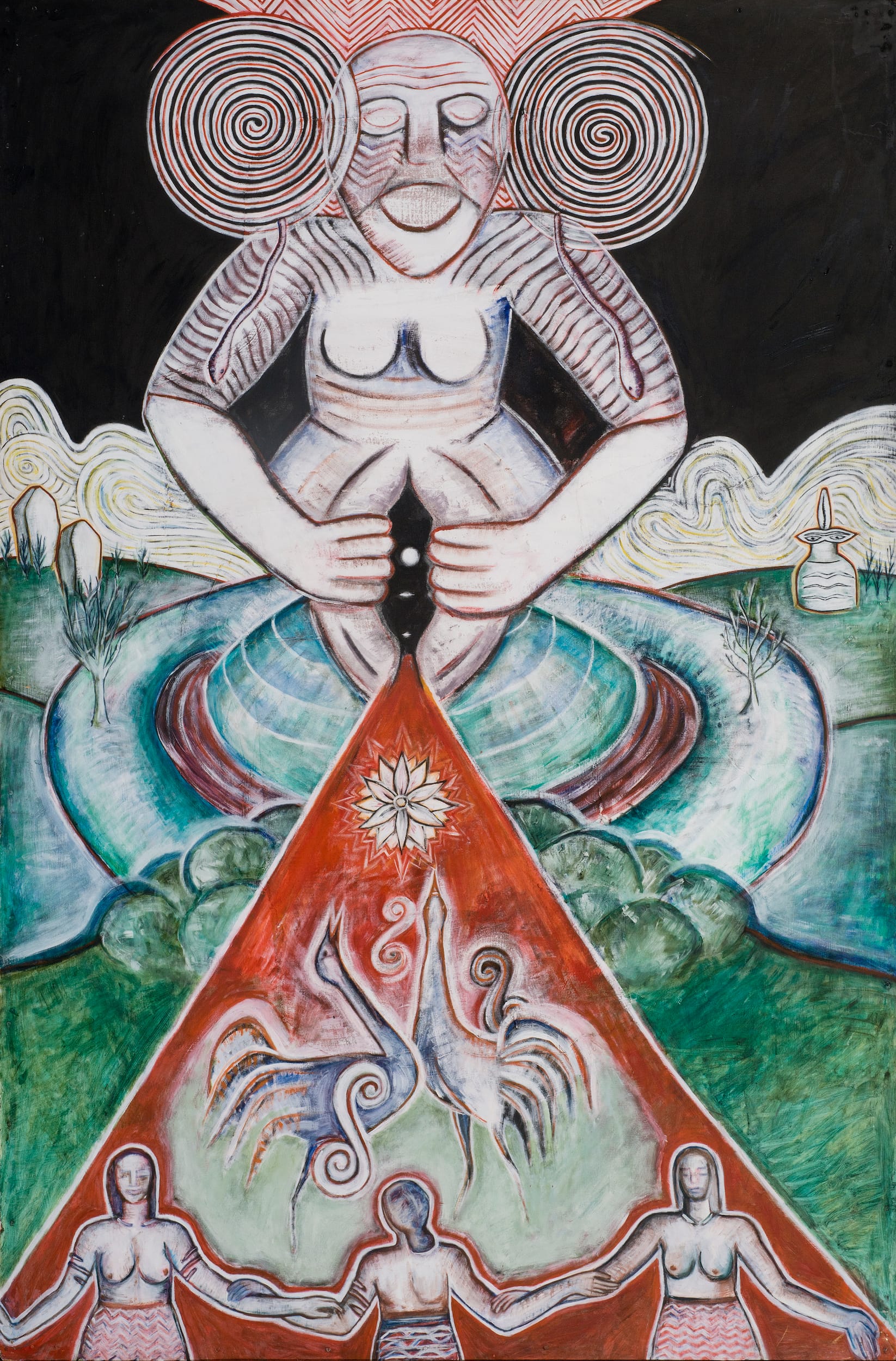 Born in 1938 in Sweden, the artist lived in the UK from the 1950s until her death in 2005. Her early work is characterized by calls to radical feminist action, often incorporating pithy slogans or demands. However, with “God Giving Birth,” Sjöö began to combine these concerns with her interest in ancient matriarchal societies and in the figure of the Great Mother goddess as the source of all life. Her paintings became attempts to channel the Great Mother, manifested through composite landscapes made up of sacred sites and symbols. These geographical non-sequiturs cohere through a collage-like technique of overlapping images and complex geometries.