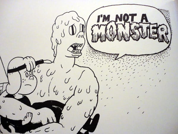Monster is monstrous: at 10”x14” and 88 pages long, it’s a gigantic collection of some of Providence’s most well-known comic artists. Comic critic Sean T. Collins affectionately describes it as “gettin’ the band back together, man!” The collection’s editor, Paul Lyons, was a founding member of Fort Thunder — once a show-space and artists collaborative house in Rhode Island, now, a genre of comics spawned from the artists who lived there. Monster features many of the original Fort Thunder team as well as some newer faces in Providence’s alternative comics scene.