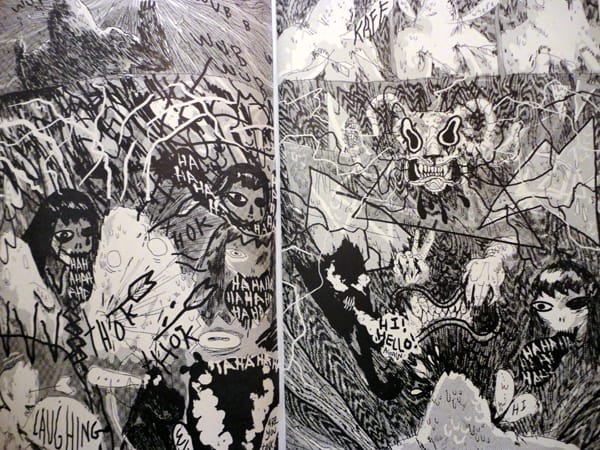 Most of the collection is made up of experimental comics that can at times be incomprehensible; like dreams or nightmares, that may be the most unsettling part. Mat Brinkman’s evil flying creatures recall Stephen Gammell’s illustrations for the Scary Stories to Tell in the Dark series, for me at least, and bring me back to that totally creeped-out-before-bedtime place.