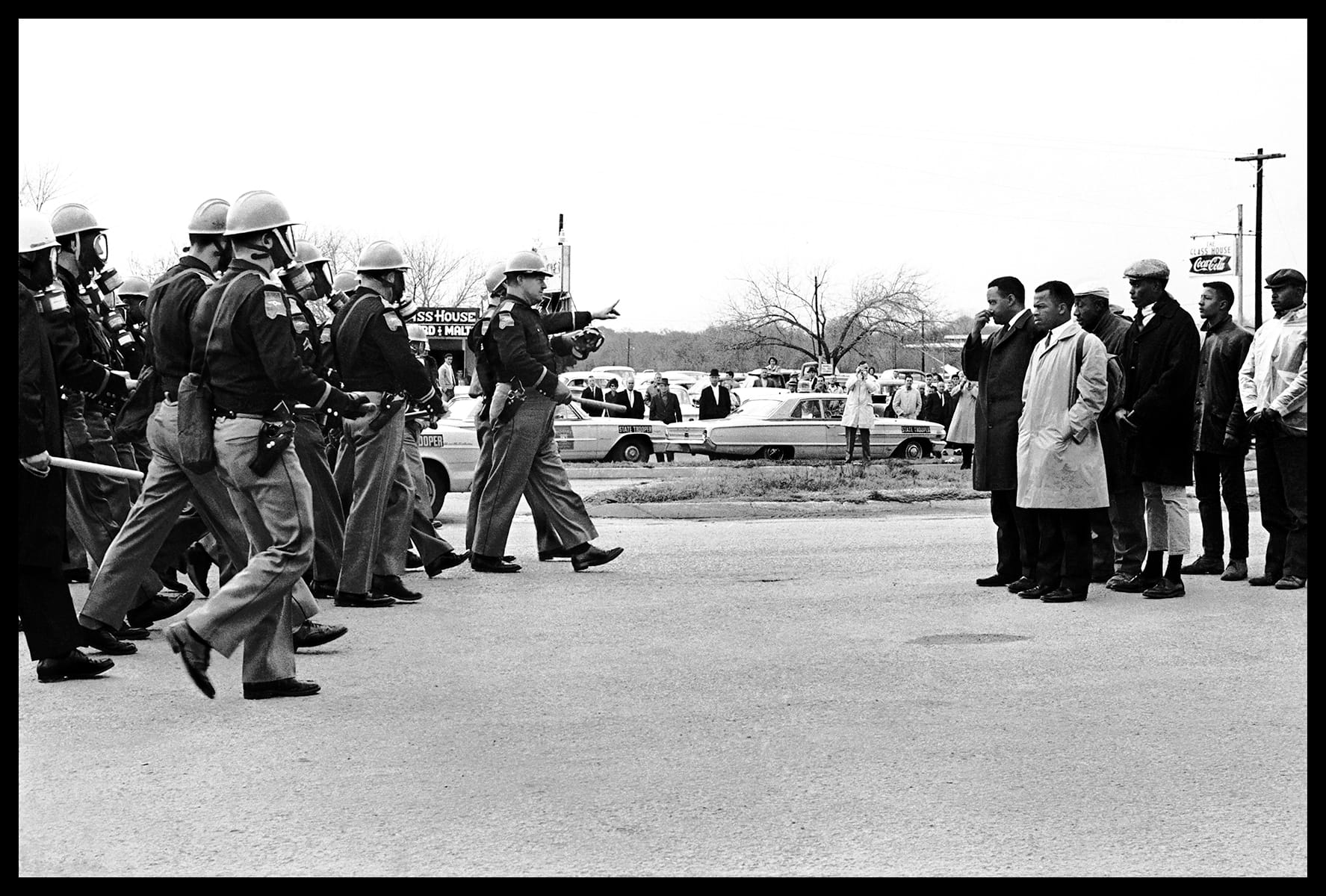 Designed by the art collective For Freedoms, founded by artists Eric Gottesman, Hank Willis Thomas, and Michelle Woo in 2016, the billboard artwork reproduces civil rights photographer Spider Martin’s iconic 1965 image “Two Minute Warning.” The photo captured the moment before state troopers charged toward civil rights leaders Hosea Williams and John Lewis on Bloody Sunday, when a police mob attacked hundreds of marchers crossing the Edmund Pettus Bridge in Selma to advocate for voting rights. Months later, Congress passed the Voting Rights Act, which mandated the enforcement of the 15th Amendment right to vote and outlawed voting discrimination practices.