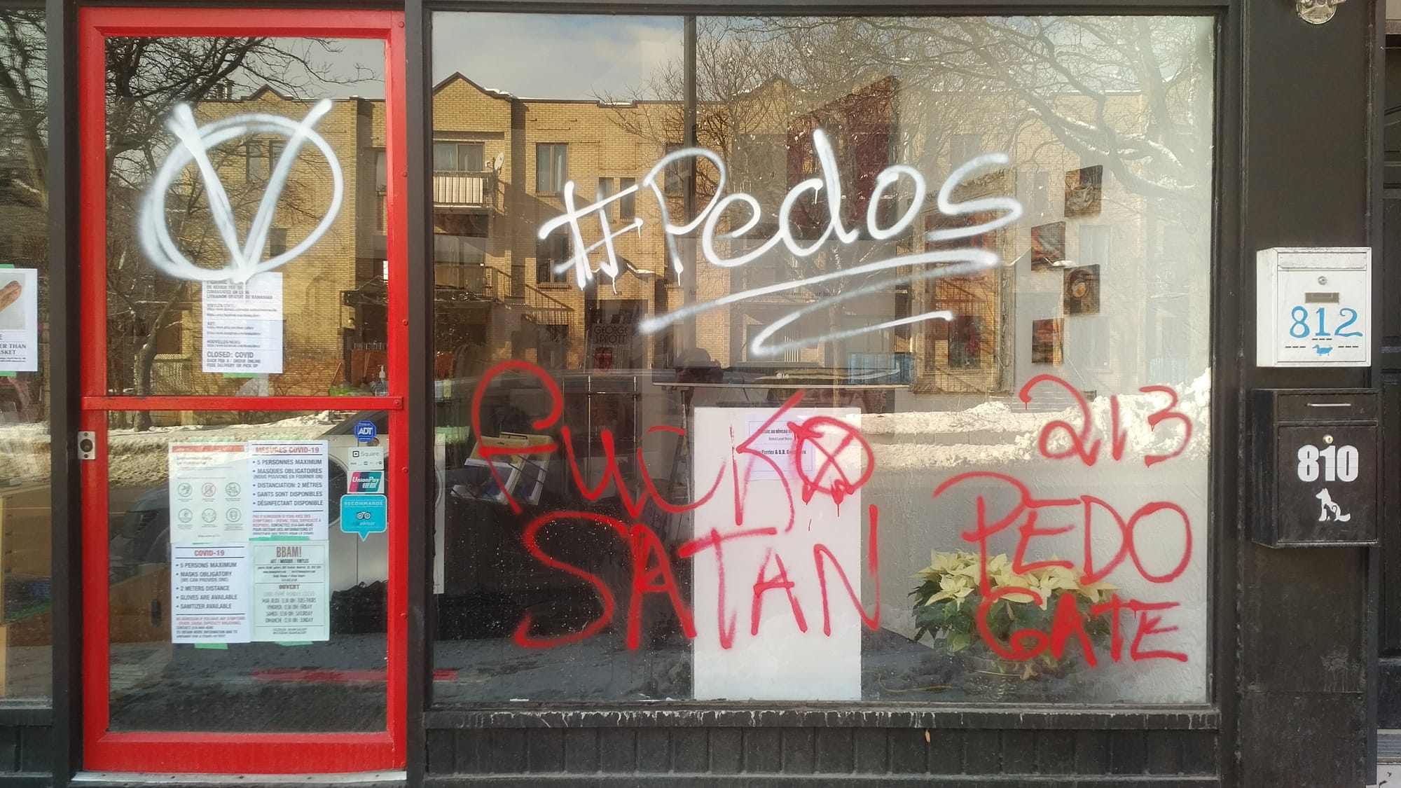 The incident occurred around 9pm on January 19, the eve of Joe Biden's inauguration as the new president of the United States. Security cameras captured a man and a woman, both clad in black, spray-painting QAnon messages like "Pedogate" and "Fuck Satan" on the storefront of BBAM! Gallery in Montreal's Saint-Henri neighborhood. The attackers also painted a circled "V" sign, known to stand for "vendetta."