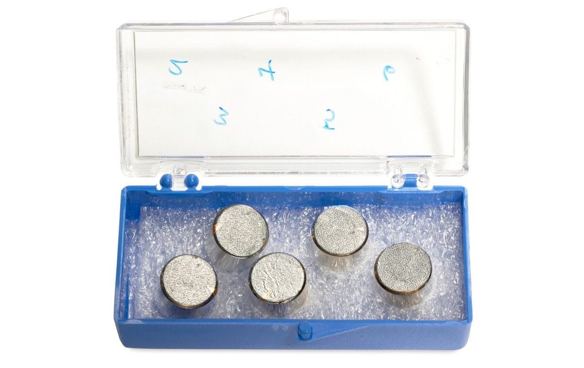 Between 1969 and 1972, astronauts brought back 842 pounds of lunar material. The Bonhams moon dust, sold last Wednesday, April 13 as part of its Space History sale, comprises five samples for a microscope, set on carbon tape on top of the aluminum stubs used with an Scanning Electron Microscope (SEM). The carbon tape on each stub is less than half an inch wide.