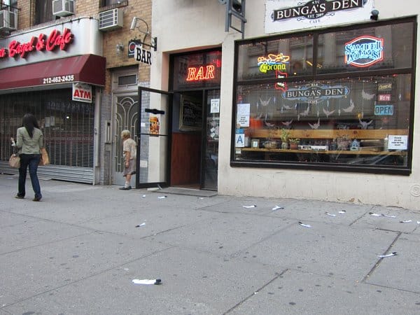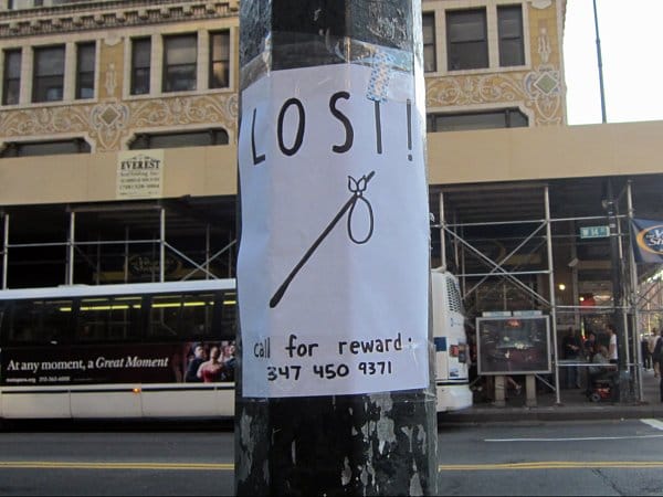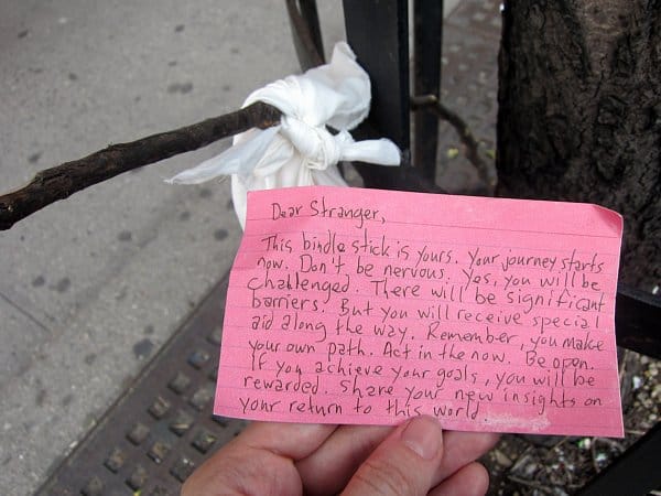 There was another moment of removal from urban reality down the street, where I started to see signs for a lost bindle stick with a number to call. Sure enough, I noticed the sticks all around, leaning against walls or subway entrances or even thrust in a trash can. The project by Ryan Singer and Jenny Santos, called “Stray, Get Found,” was intended to send participants on a “hero’s journey” inspired by Joseph Campbell. However, I tried to call the number and didn’t get an answer, so I went ahead and opened one of the sticks and found an apple and a note telling me to start my journey. I wasn’t sure if there was a next step or this was where the audience was to undertake their own imaginative adventure, so I repackaged the note and continued on the art journey I was already on.