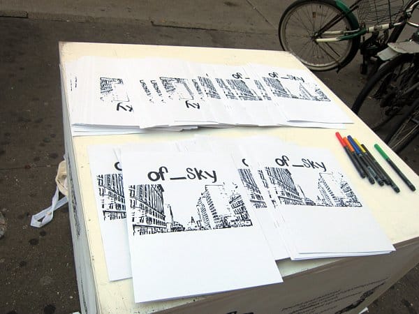 On a street corner, a table was set up offering copies of Caitlin Webb‘s “of_sky,” an illustrated guide to clouds. Her interpretative drawings were each accompanied by poetic descriptions. For example, for stratocumulus: “the cloud of all clouds/saunter in couplets.”
