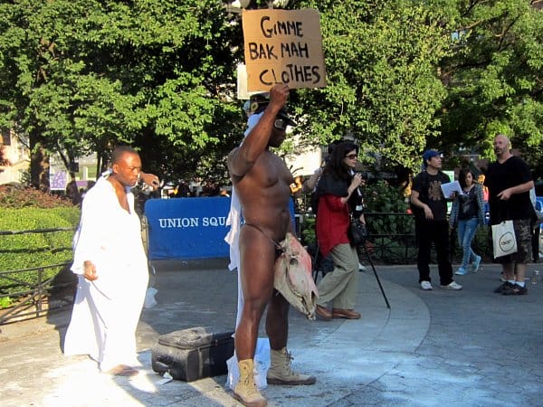 Right off the subway in Union Square, I was absorbed by the crowd surrounding Lawrence Graham-Brown, who was standing nakedly, both literally and spatially, right in front of the statue of George Washington. A man in a flowing robe was circling him, throwing water and white powder on his skin. The performance, called “Gimme Bak Ma Clothes!,” was inspired by Thomas Dartmouth Rice, a white man who played the racist Jim Crow character in minstrel shows of the 1830s, and the throwing of the powder was meant to be an act of cleansing and blessing.