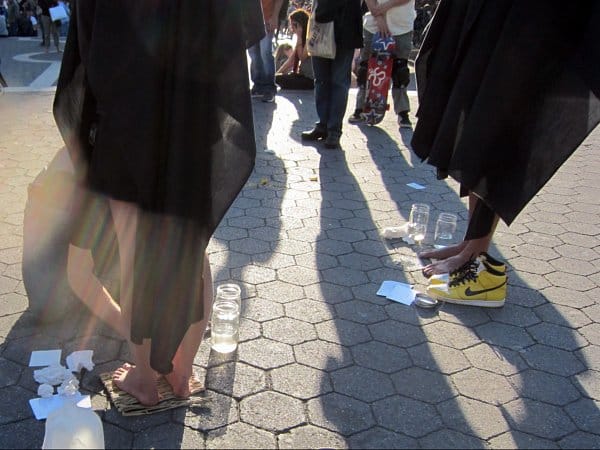 Mixed with the crowd around Graham-Brown was another act of cleansing. For Rob Andrews‘ “Union Square Clean,” people were standing under black shrouds, with instructions on how to wash their feet. Surprisingly, or at least to me, people were actually performing the ritual.