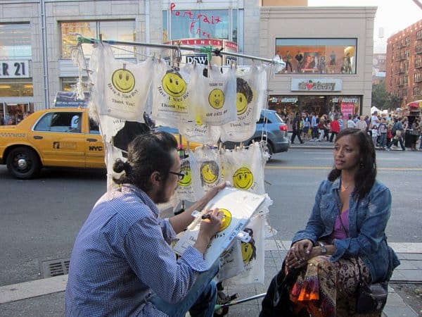 Continuing away from the center of Union Square, I found Nobutaka Aozaki drawing free portraits of people on shopping bags for his “Smily Bag Project.” The nature of his medium made all of his portraits lovingly simplistic, but I like how he was seriously engaging with his subjects as much as the portrait artists in Times Square who inspired him.