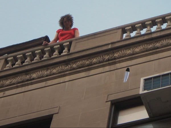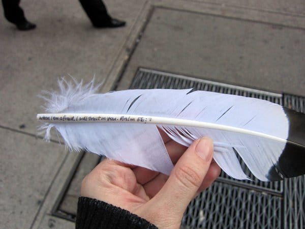 Feathers were drifting down onto the sidewalk and I looked up to see Bindi Cole dropping them from the top of a building. Her piece, “The Shelter Under the Shadow of His Wings,” was the only project I encountered in Art in Odd Places that seemed to lack any sort of irony when interpreting the ceremonies of religion. Each feather has a quote from the Bible, meant to be reminders of the voice of God lost in the shrill noise of the city. She wrote in her artist statement: “God is speaking to you. He has been all along. In a quiet still voice like the fall of a feather, he calls to you.” I’m not a religious person, but I still found it a touching pause to pick up a feather and read the words “When I am afraid, I will trust in you” while the Saturday sidewalk crowd moved by.