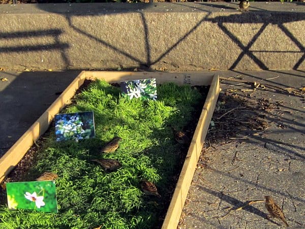 I took a break in Hudson River Park, where I saw Doreen Kennedy‘s “Flower Bed.” The artist was off-duty, so there were only a few of the hundreds of flower photographs that were in the grass during performance hours. Even empty, it was still a charming little installation, as it had attracted a gathering of small birds who were eagerly digging at something in the soil.