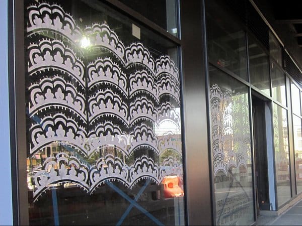 Back on 14th Street by the entrance to the High Line, I saw some work by Konstantin Dimopoulos, part of his “The Tattooed Tailor” project. The elegant lace street art was definitely an improvement over the blue tape slashed over the empty storefront windows. I also like the idea of a graffiti artist being a gentleman set on bringing fine tailoring to the streets.