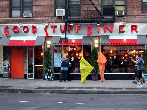 Further down the street, I looked across and saw Sherry Aliberti‘s “Cocoon” people cavorting jerkily along the sidewalk. According to her statement, the “cocoons” were journeying across 14th Street to gather at the Hudson River Park for sunset, but I saw them in the middle of the afternoon. They must have been taking advantage of the sunny fall day to unnerve the weekend crowds.